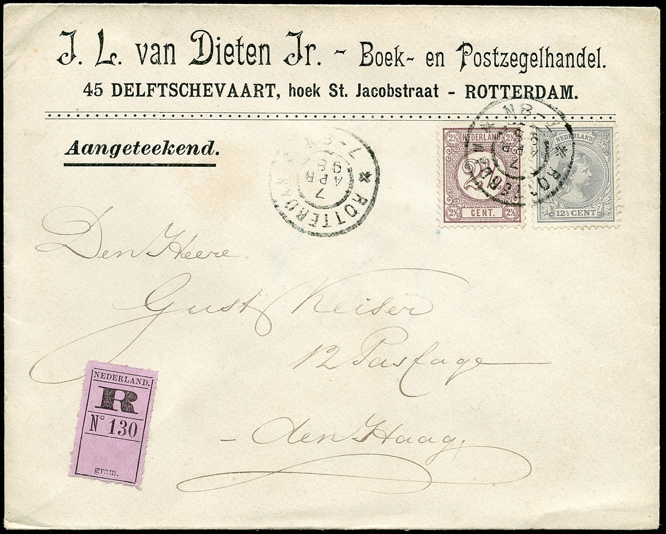 Op 7-4-1898 aangetekend verzonden couvert van een gerenommeerde firma in Rotterdam naar een andere in Den Haag