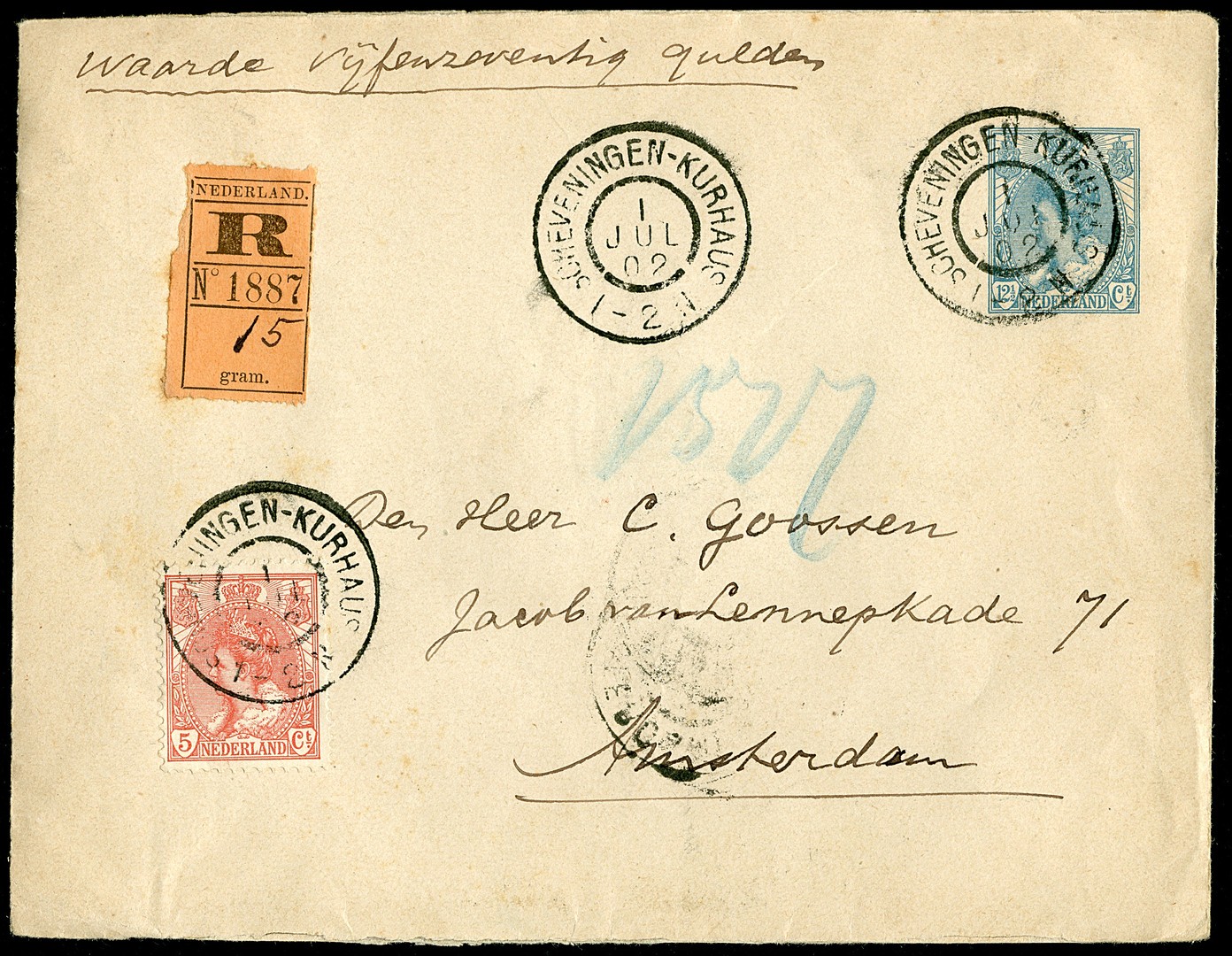 Env. G9 bijgefr. met 5c Bontkraag met aangegeven waarde van fl. 75 afgest. grootrond Scheveningen-Kurhaus 1-7-1902 naar Amsterdam 1-7