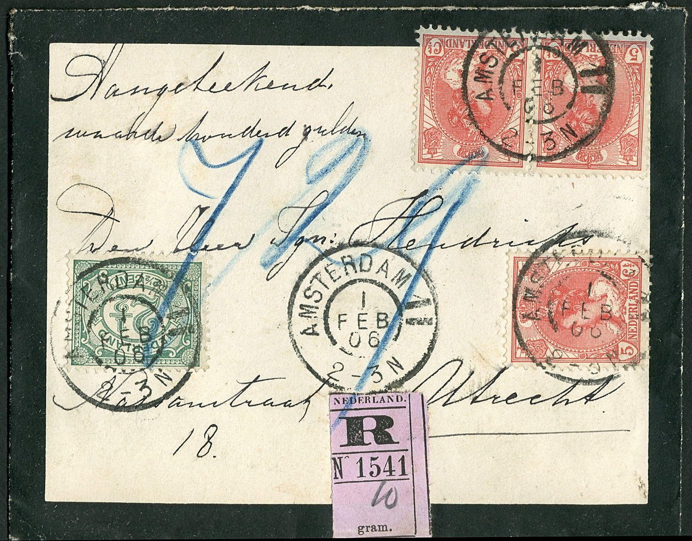 Een valeur-rouwbrief. Rouwcouvert gefr. met 2½c en 3x 5c met aangegeven waarde van fl. 100 op 1-2-1906 van het bijpostkantoor Amsterdam 11 naar Utrecht 1-2