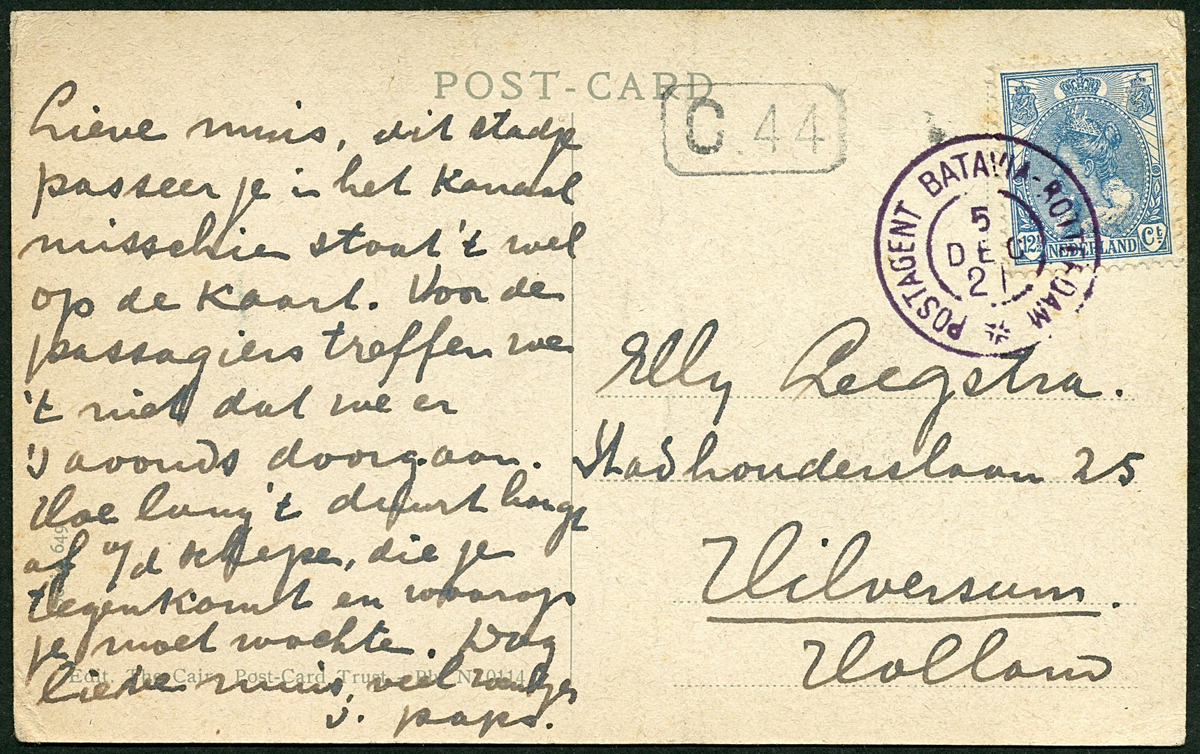 Grootrondstempel Postagenten Batavia-Rotterdam (violet, 1921), id. zwart (1912), Rotterdam-Batavia (1906), Amsterdam-Batavia (1909) en Batavia-Amsterdam (1909), luxe afst. op vijf prentbk. gefr. met Bontkraagzegels