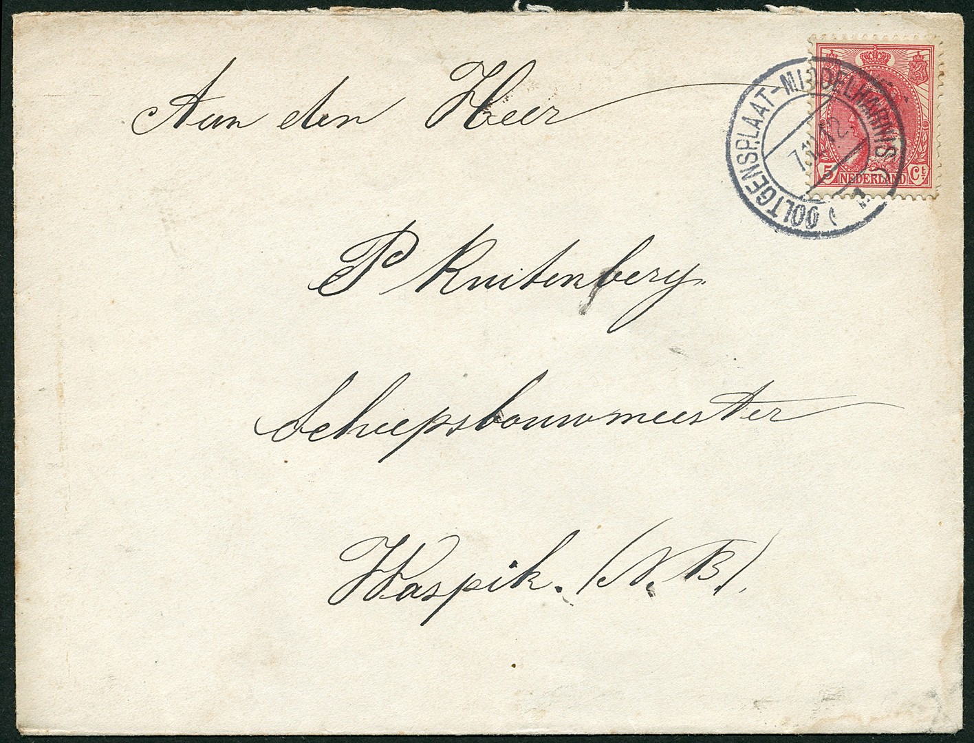 Trajectstempels OOLTGENSPLAAT-MIDDELHARNIS / (I) en OUDDORP-MIDDELHARNIS (III)? op twee met 5c Bontkraag gefr. env. van 7-12-1912 naar Waspik resp. 13-5-1919 naar ´sGravenhage. Zeer schaars op poststuk!