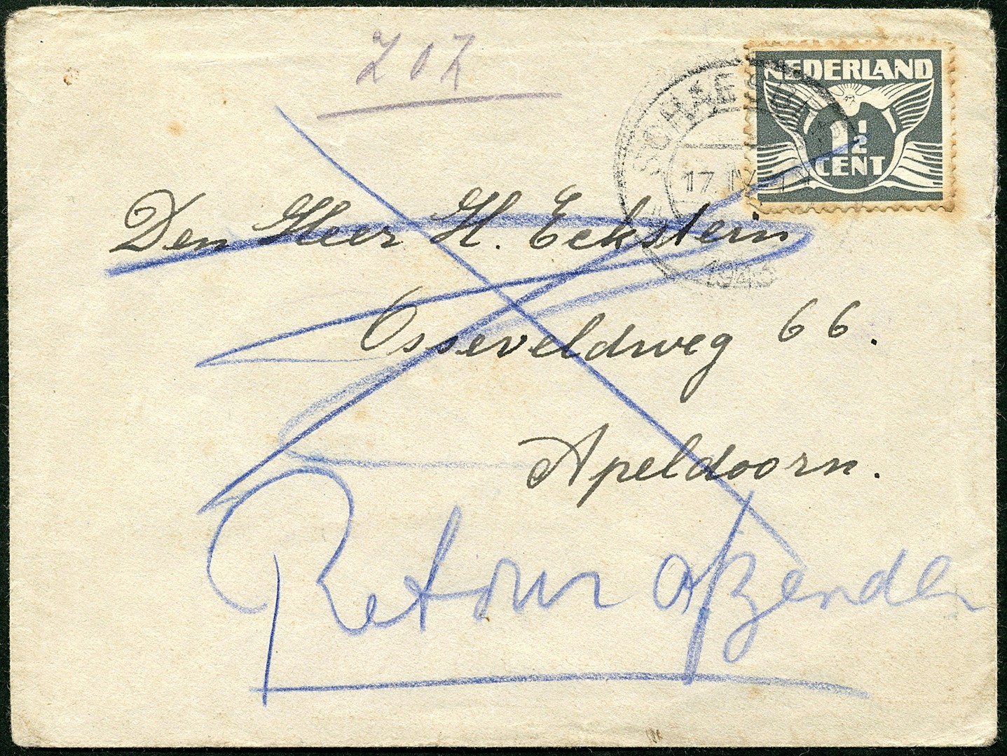 Env. gefr. met 1½c van Schaesberg 17-4-1943 naar de heer Eckstein te Apeldoorn, doch ´Retour afzender´, met op az. geschreven ´Vertrokken naar Westerbork´