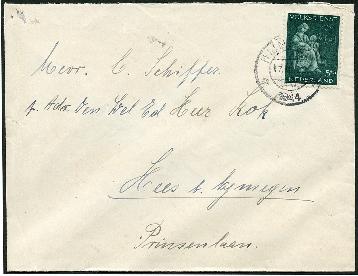 Volksdienstzegel 5c nr. 425 als correcte enkelfrankering op locaal verz. env. van Nijmegen 17-3-1944 naar Hees bij Nijmegen. Zeldzaam! € 200
