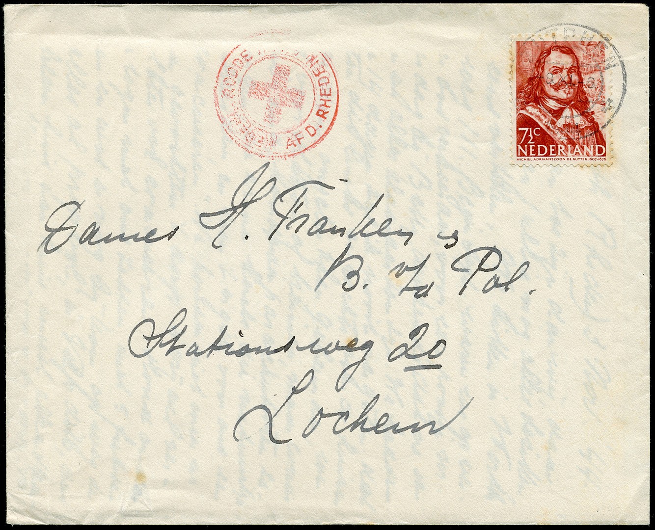 Rode Kruis. Env. gefr. met 7½c via het Ned. Roode Kruis Afd. Rheden over Zutphen 8-11-1944 naar twee dames in Lochem, met inhoud, een aangrijpend relaas op 3-11 geschreven te Wordt (Rheden), o.a. met smeekbede ´Daarom nog eens, toe help ons, in Godsnaam, help ons, we weten geen raad.´