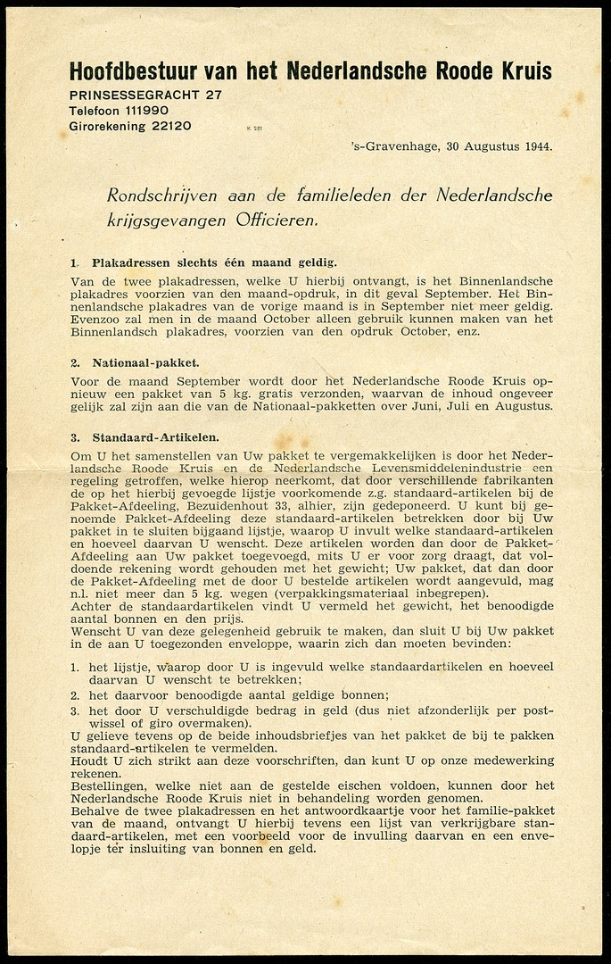 Rode Kruis. Gedrukt ´Rondschrijven aan de familieleden der Nederlandsche krijgsgevangen Officieren´ etc. betreffende inhouden van pakketverzendingen, post, etc. naar verschillende kampen. In totaal 16 ex. tussen maart 1943-augustus 1944, in deze verscheidenheid zeldzaam!
