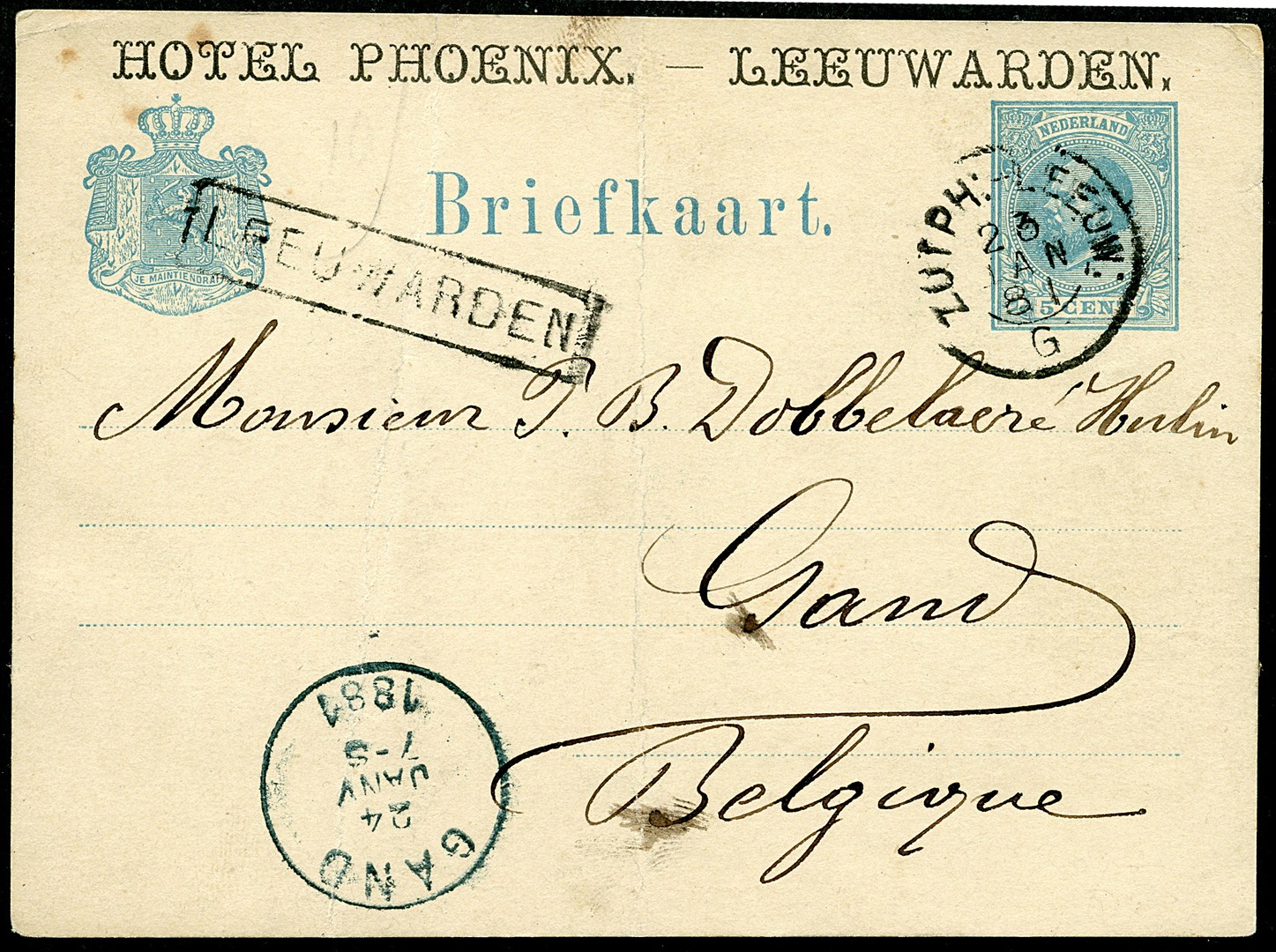 Particulier bedrukte bk. G16 (vert. vouwen) met zwarte druk ´HOTEL PHOENIX. - LEEUWARDEN.´ afgest. met haltestempel Leeuwarden, per traject Zutph:-Leeuw: 23-1-1881 naar Gent 24-2