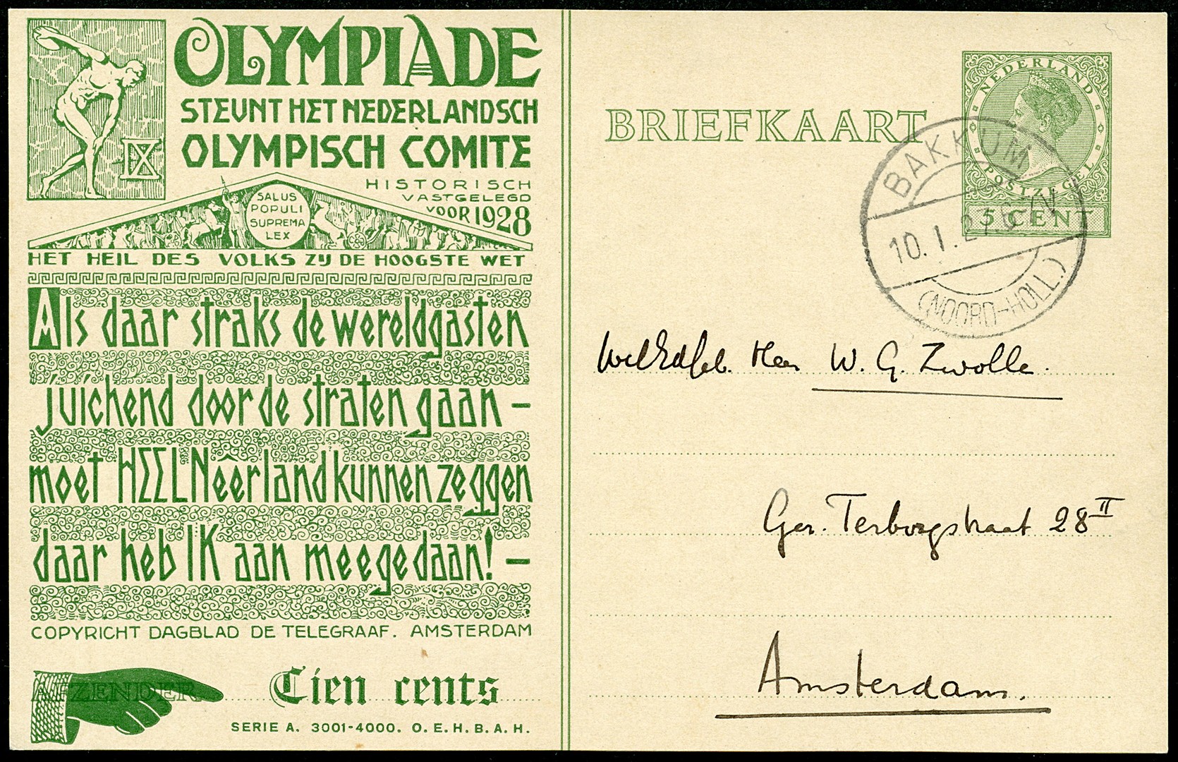 Particulier bedrukte bk. Olympiade 1928, OL12. Prachtkaart van Bakkum/(Noord-Holl.) 10-1-1927 naar Zwolle in Amsterdam