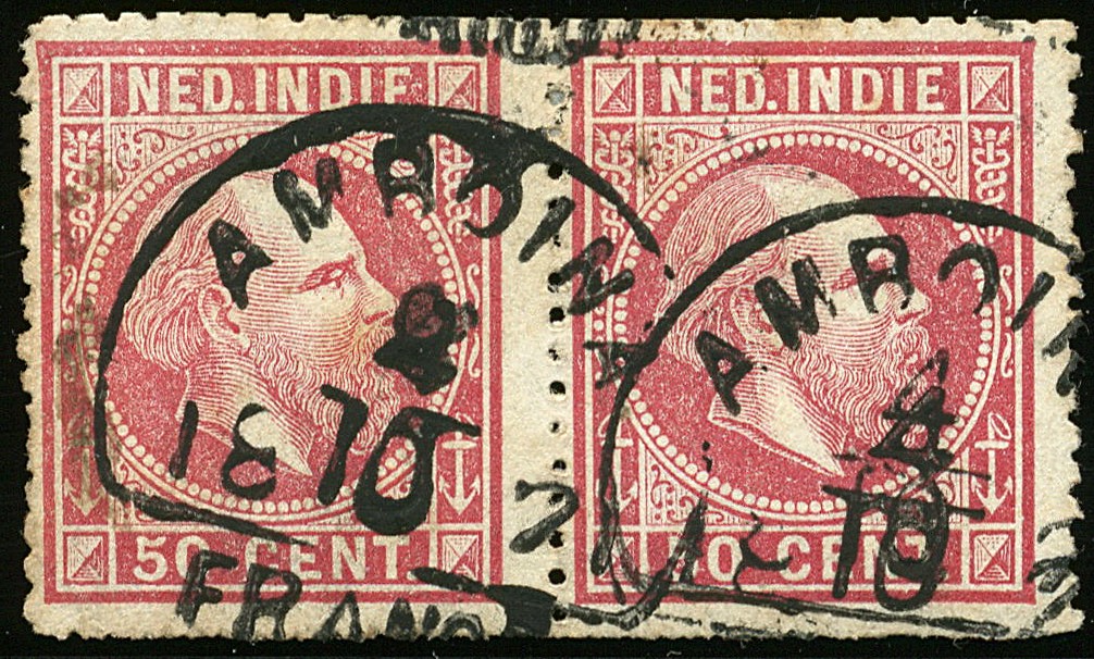 Halfrond-franco AMBOINA op 50c nr. 15. Vr. prachtpaar met twee mooie afst. van 4-10-1871