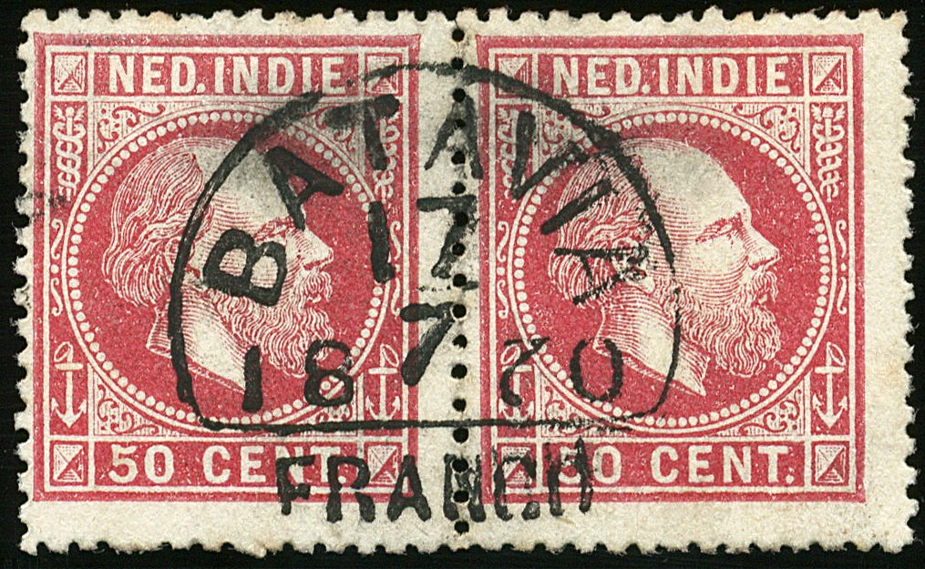 Halfrond-franco BATAVIA op 50c nr. 15. Prachtpaar met superbe afst. van 17-7-1870 (zware letters en wat ver uit elkaar)
