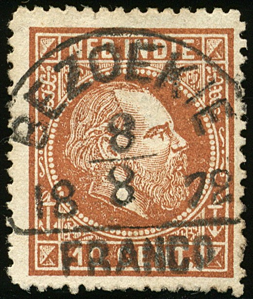 Halfrond-franco BEZOEKIE op 10c nr. 9. Superbe afdruk van dit op deze zegel uiterst zeldzame stempel van 8-8-1872. Slechts enkele afdrukken bekend! Een pronkstuk van elke collectie halfrond-francostempels (V.1250)
