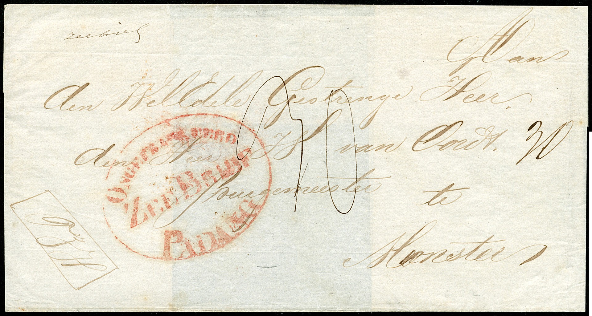 Ovaalstempel 'Ongefrankeerd/ZeeBrief/Padang' (WdB.208c) op frisse briefomslag via 'sGravenhage 4-6-1860 (?) naar Monster, alsmede ovaalstempel 'Franco/ZeeBrief/Padang' (WdB.209c) op cpl. vouwbrief van 16-6-1853 naar Batavia