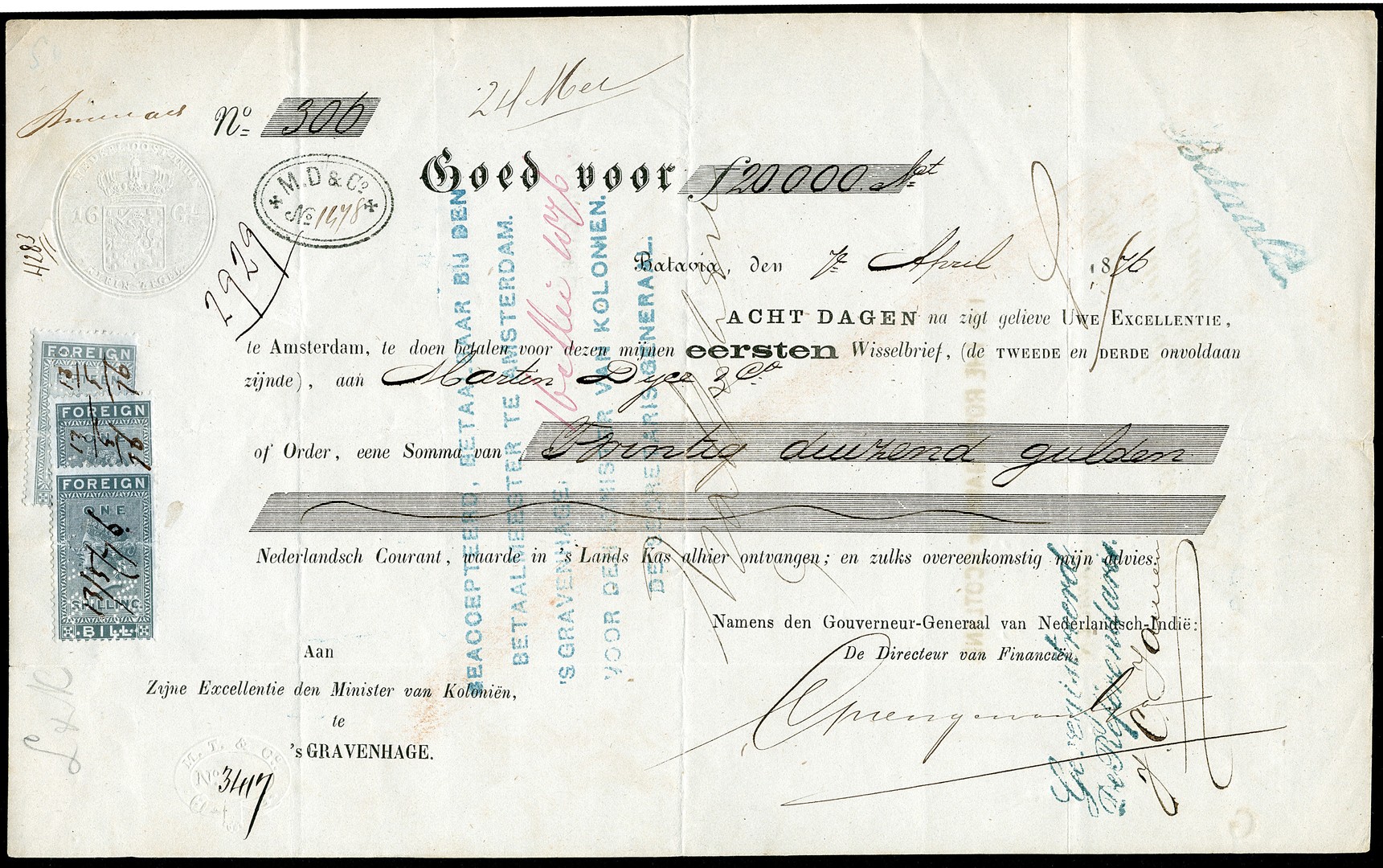 Kwitantie nr. 306, uitgeschreven te Batavia op 7-4-1876, ondertekend door de Directeur van Financiën, geldbedrag fl. 20.000, uitgekeerd op 13-5-1876 via de Royal Bank of Scotland. Mooi bewaard gebleven document met notities, stempels, ingedrukt Nederlands kleinzegel van 16 Gl en drie Britse fiscaalzegels (vouwtjes)