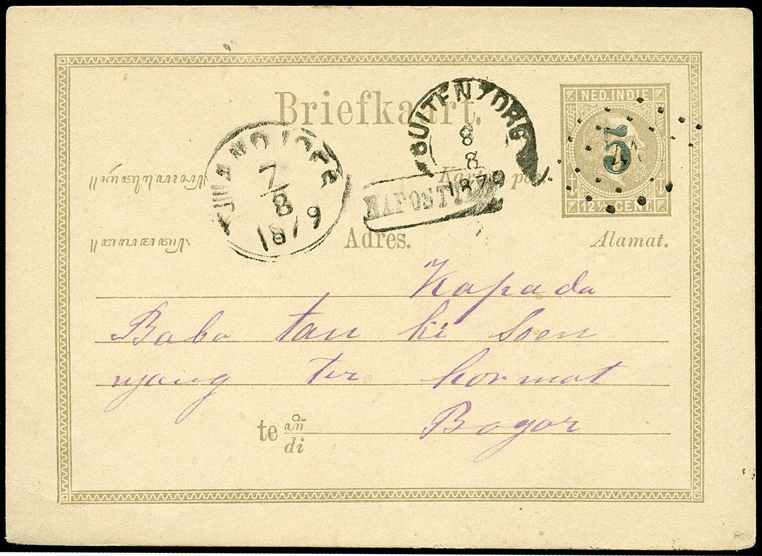 Bk. G4a ´Na Posttijd´ van Tjiandjoer 7-8-1879 naar Bogor = Buitenzorg 8-8. Zie over Tjiandjoer en de opdruk ´5´: Geene olla podrida (De Postzak 197, dec. 2003, ill. blz. 415)