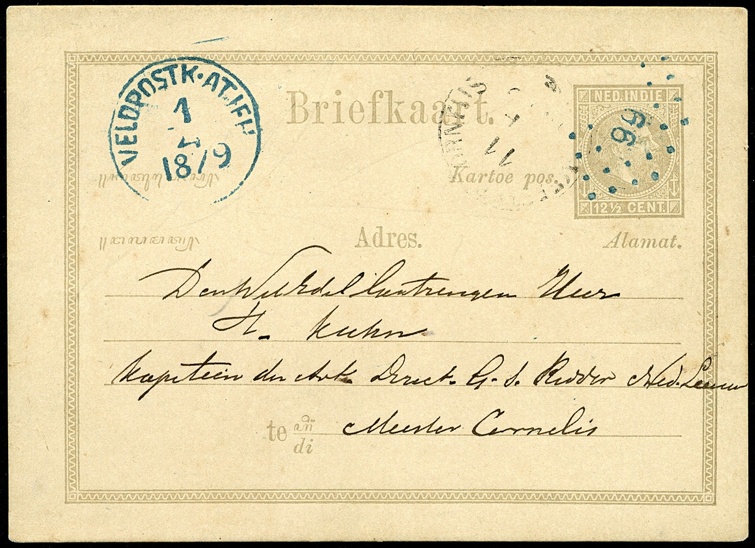 Bk. G3 uit Indrapoeri 20-3-1879 ´We zijn in 2 dagen hier gekomen met een totaal verlies van 44 dooden en gewonden...´, afgest. Veldpostk.Atjeh 1-4-1879 met puntstempel 66 in blauw naar Meester Cornelis 11-4. Toevallig werd op 1-4-1879 het tarief voor deze voor het buitenland bedoelde kaart verlaagd naar 7½ cent, maar kon in het binnenland ook worden gebruikt