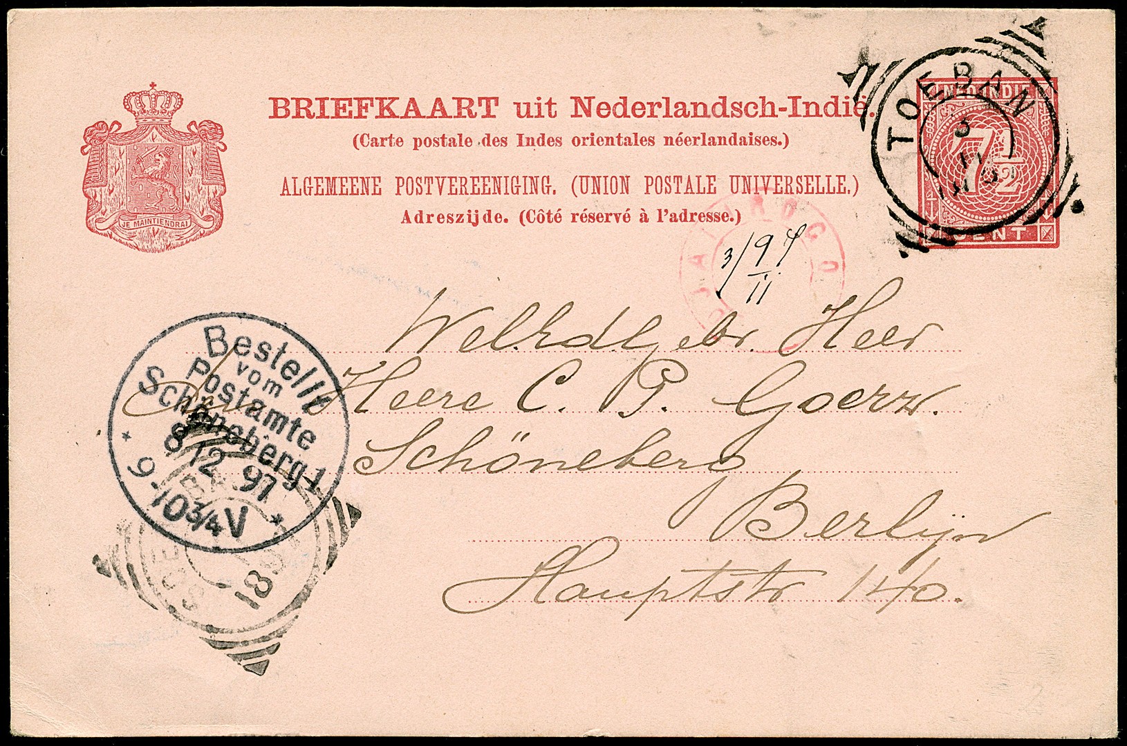 Rode afst. van een bestelhuisstempel, type ´kleinrond´ van DJATIROGO met daarin geschreven datum ´3/11 97´ op bk. G12 via Toeban 3-11 en Soerabaja 4-11 naar Berlijn 8-12. Twee afstempelingen bekend, een in blauw van ´31/12 98´en deze in rood. Stempelrariteit!