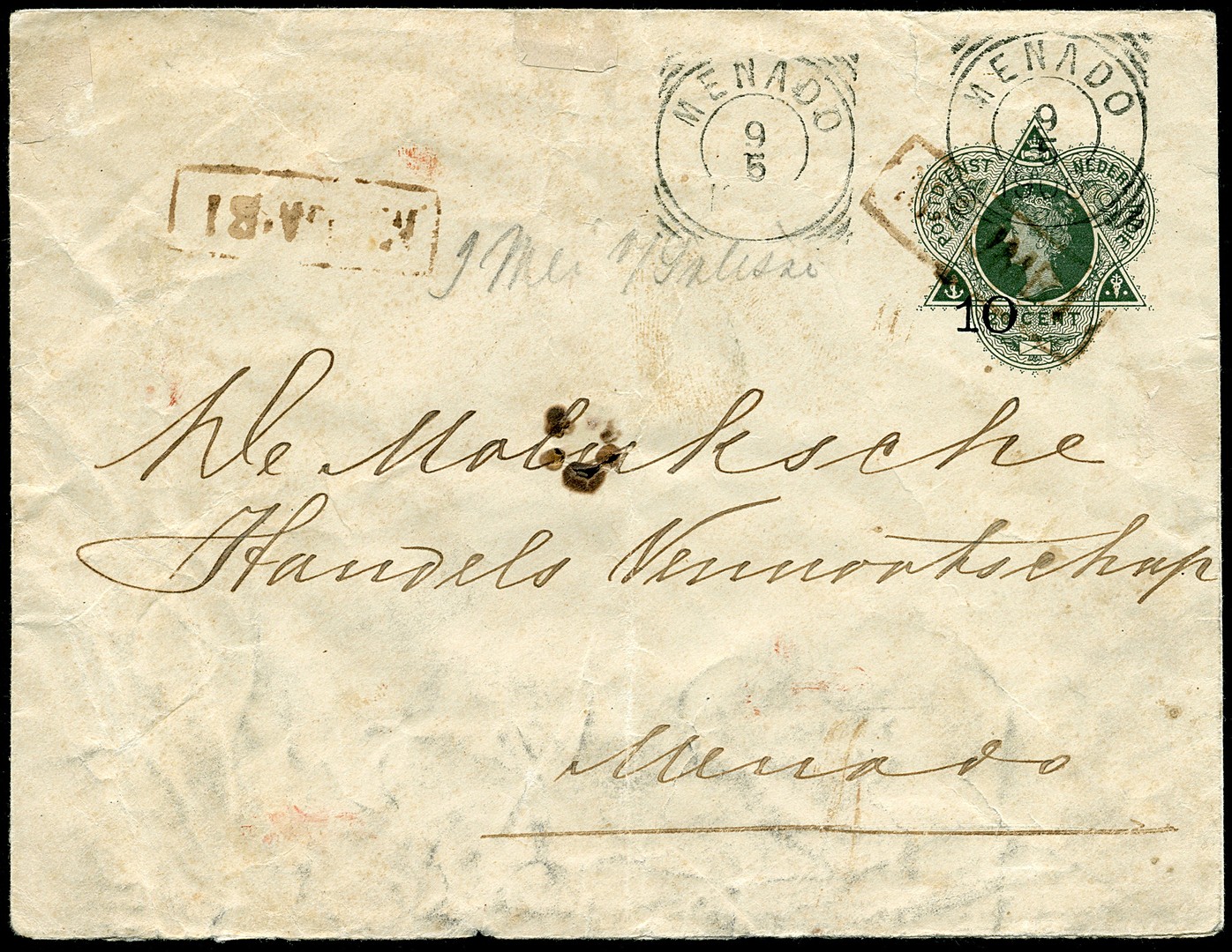 Env. G25 (gebreken) 2x afgest. met naamstempel MAOEMBI in fletsrood naar Menado 9-5-1906. Maoembi is een fungerend hulppostkantoor, iets ten oosten van Menado, waarvan deze afstempeling pas onlangs is ontdekt en nog niet is beschreven in de literatuur. Ondanks kwaliteit een unicum
