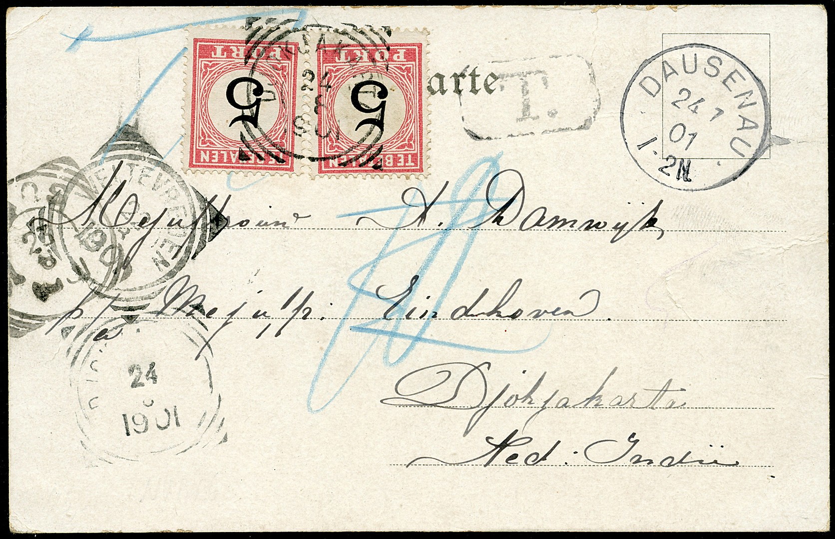 Ongefr. verz. prentbk. uit Dausenau (D) 24-7-1901 over Weltevreden 22-8 en Maos 23-8 naar het adres van mejuffr. Eindhoven te Djokjakarta en daar met 2x 5c beport