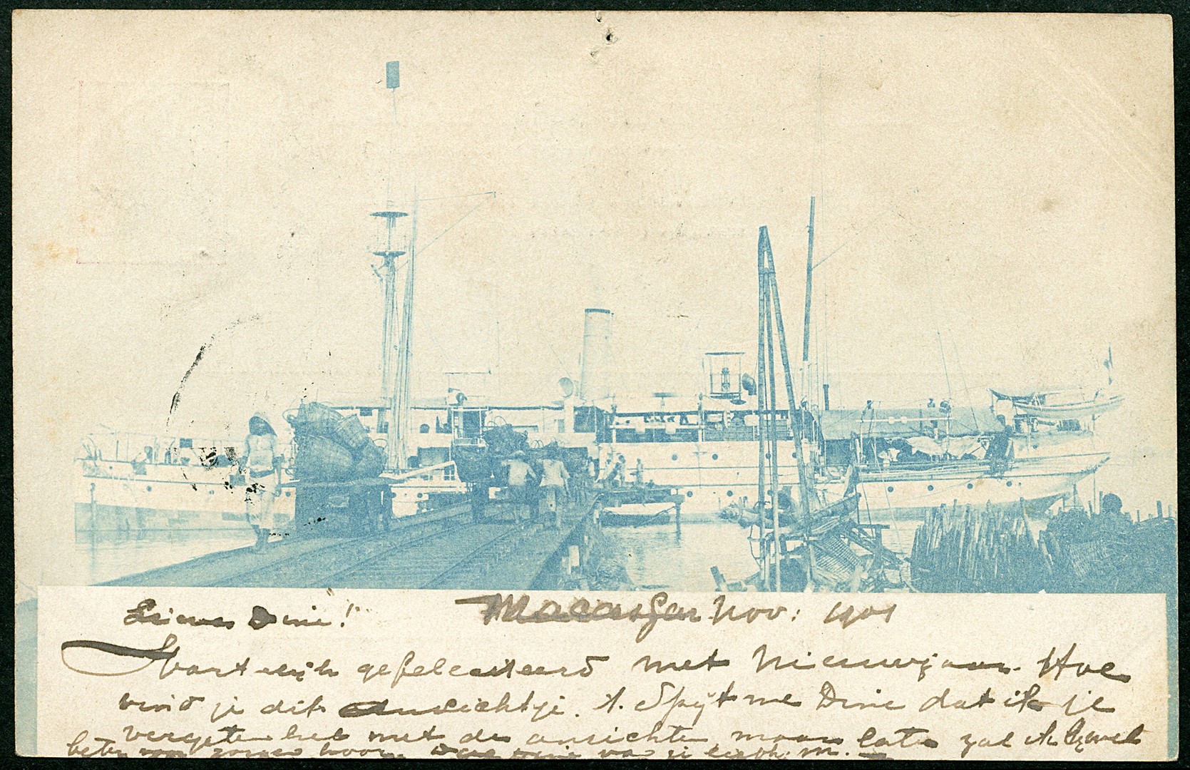 Bk. G12 met aan schrijfzijde mooie foto ingedrukt van een schip dat wordt geladen, van Makassar 11-1901 over Weltevreden 24-11 naar Delfzijl 21-12