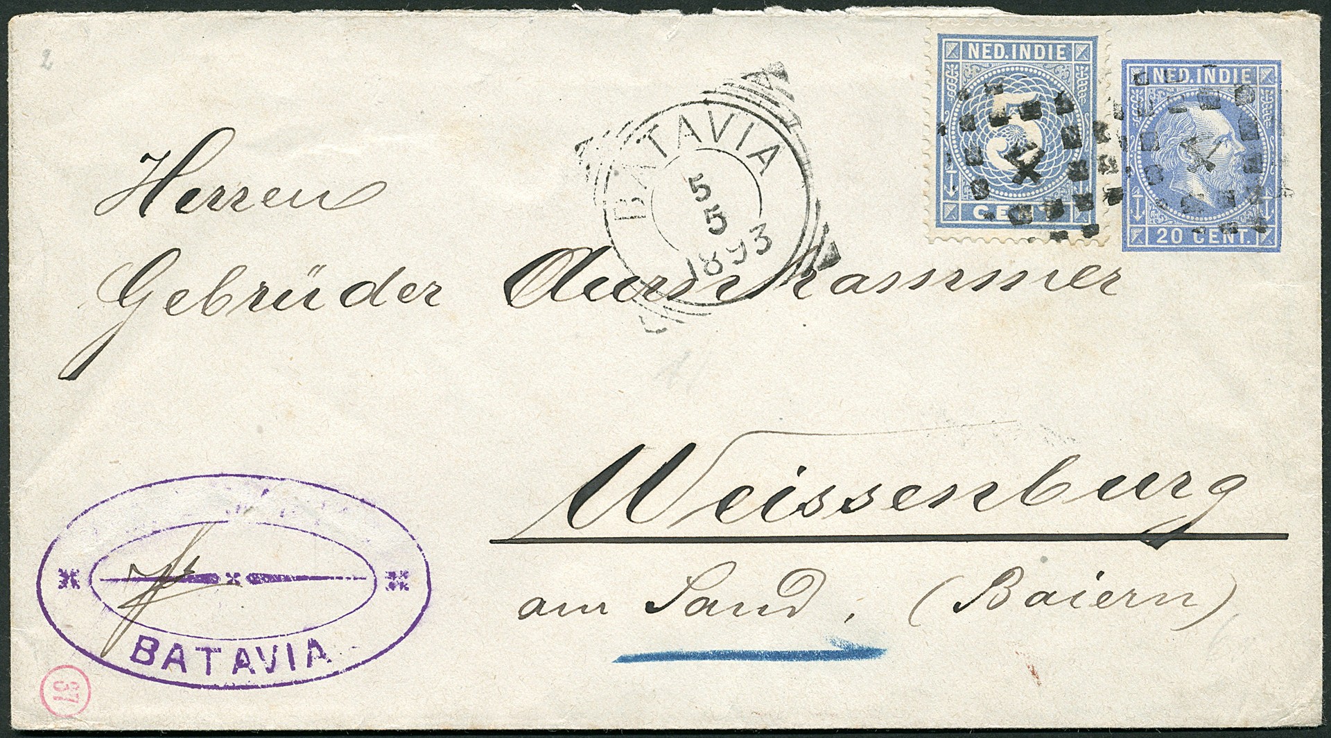 BATAVIA met puntstempel 4 op env. G2b bijgefr. met 5c van 5-5-1893 via Weltevreden 5-5 naar Weissenburg a/S 4-6. Laat gebruik van het puntstempel!