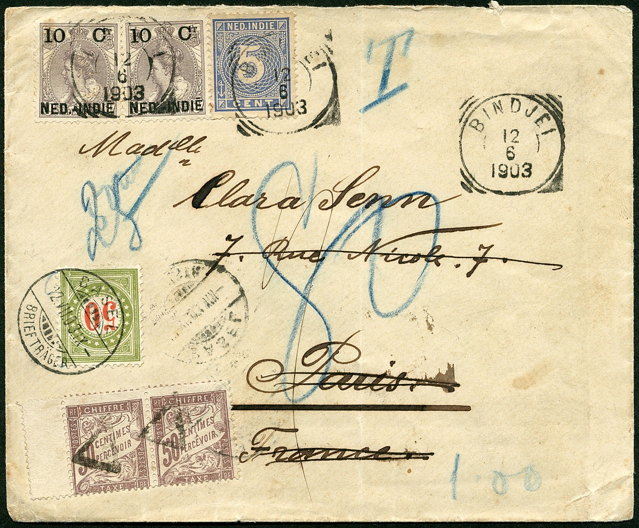 BINDJEI op env. (nauwelijks zichtbare vert. vouw) gefr. met 5c en 2x 10c, ontoereikend want 2e gew. klasse, op 12-6-1903 via Medan en de N.I.Postagent Penang naar Parijs, daar beport met 50c in randpaar, naar de mademoiselle bevond zich blijkbaar in Basel, daar op 12-7 met 50c beport