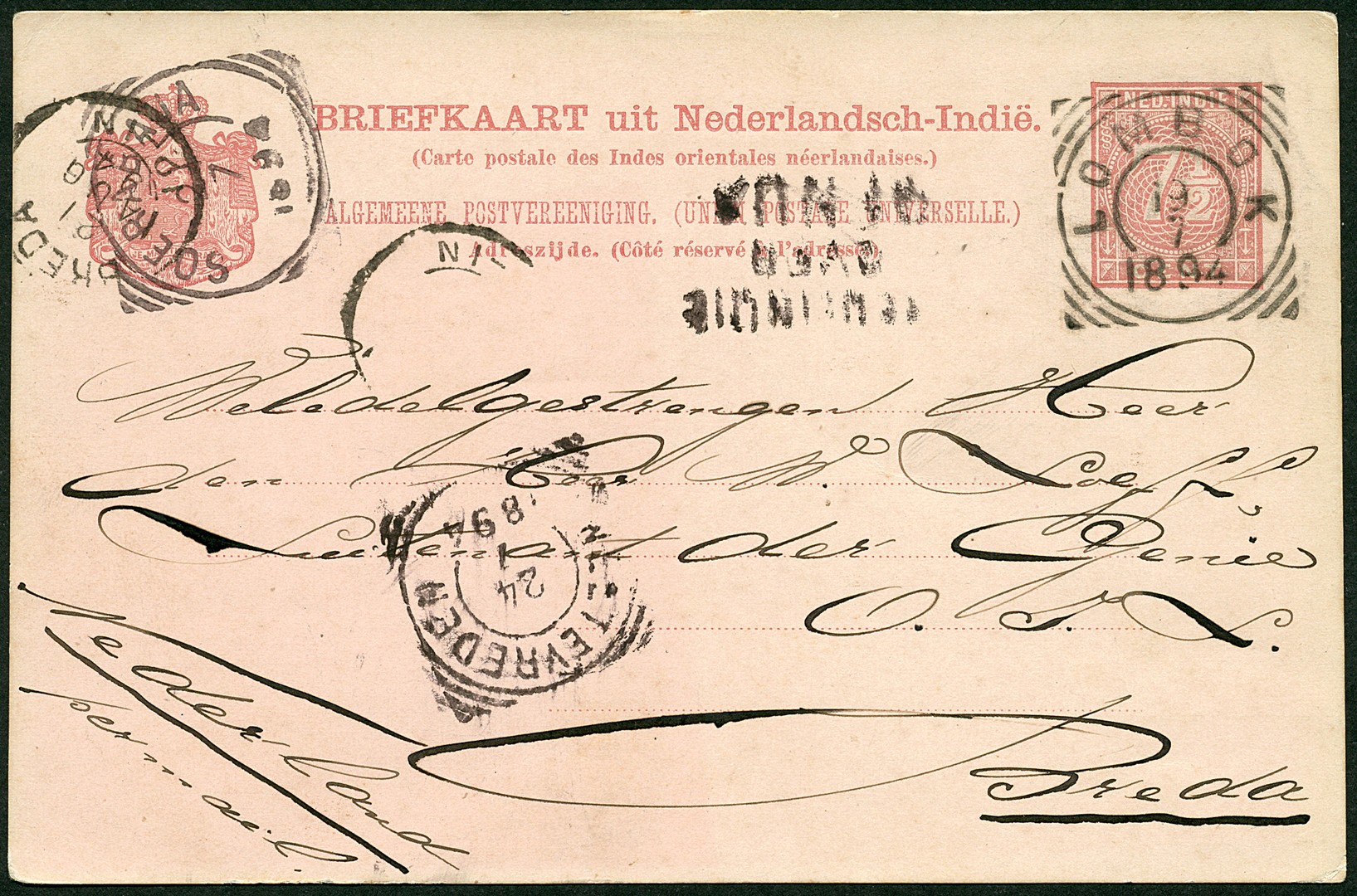 LOMBOK op bk. G12 geschreven te Tjakranegara op 19-7-1894 via Soerabaja 21-7 en Weltevreden 24-7 over Genua naar Breda 21-8. Luxe afst. van dit veldpostkantoor (SvL 125)