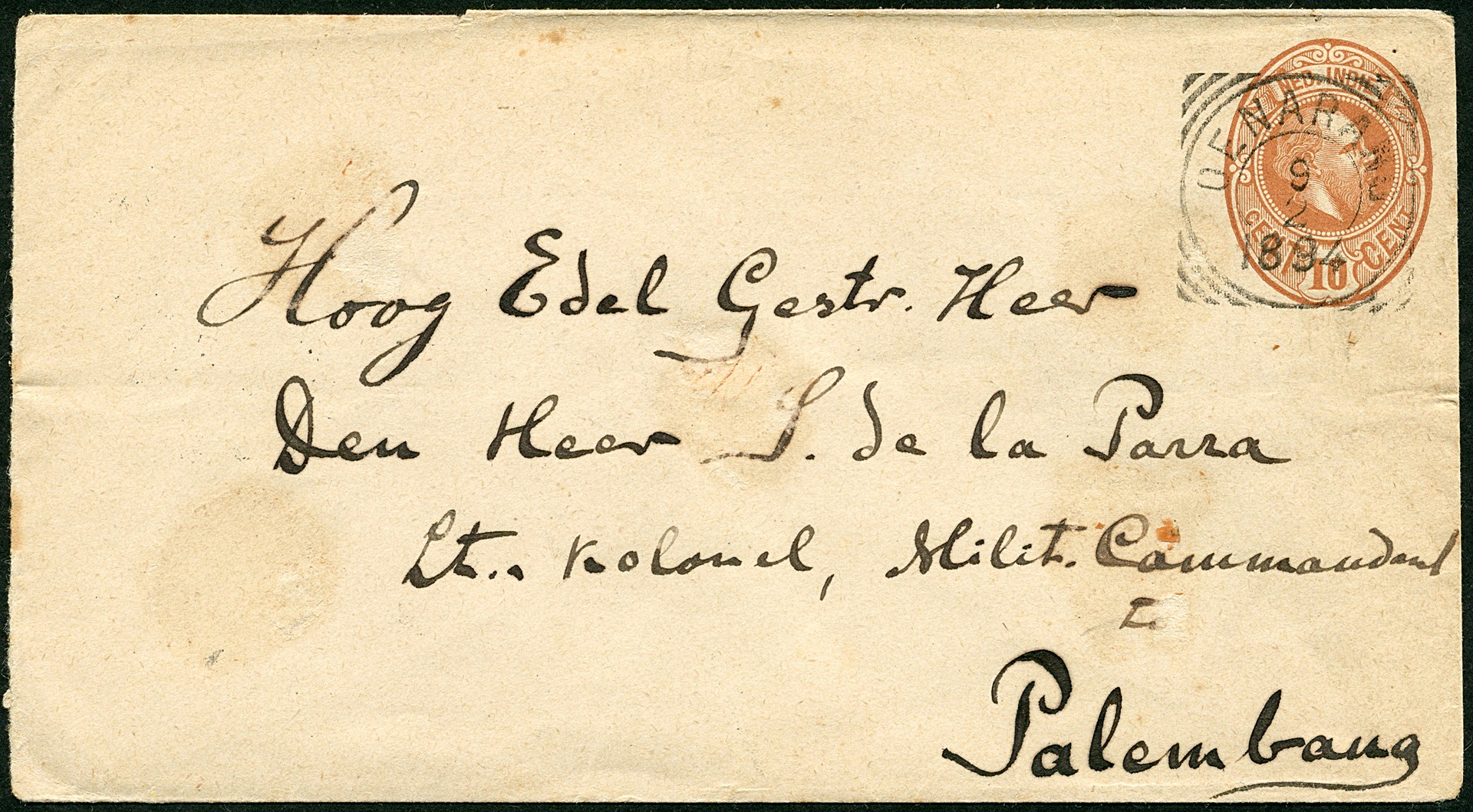 OENARANG op iets minder mooie env. G6 van 9-2-1894 over Semarang 10-2 en Weltevreden 12-2 naar luitenant-kolonel De la Parra, militair commandant te Palembang 19-2. Prima afdruk van dit zeldzame stempel (SvL R)