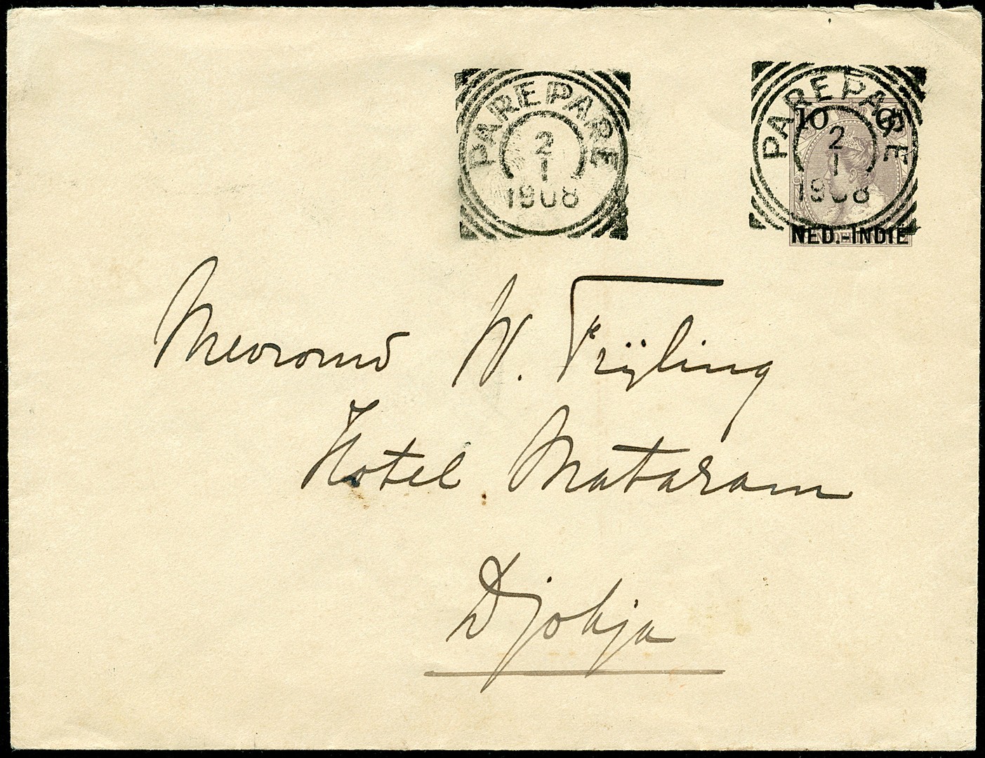 PARE PARE op env. G18 van 2-1-1908 over Makasser 8-1 en Soerabaja 11-1 naar een hotelgast te Djokjakarta 12-1. Twee prachtige afst. (SvL 100)