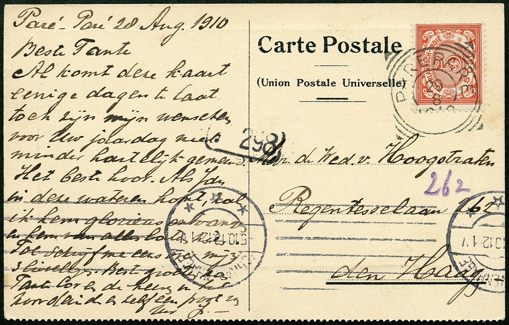 PARE PARE op prentbk. gefr. met 5c verz. op 29-8-1910 naar ´sGravenhage 5-10