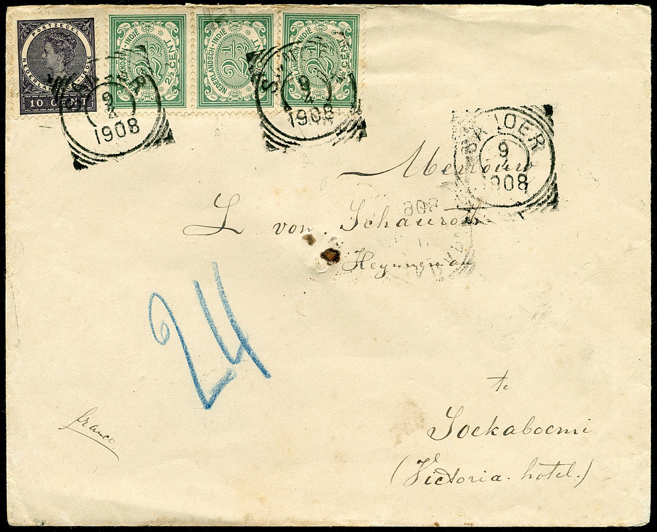 SANOER op env. van 24 gram gefr. met 10c en 3x 2½c (tarief voor brieven 20-40 gram) van 9-4-1908 over Singaradja 11-4 (noordkust Bali) en Soerabaja 15-4 naar een hotelgast te Soekaboemi 17-4. Drie goede afdrukken van dit zeldzame kantoor dat nog geen anderhalf jaar was geopend (SvL 400)