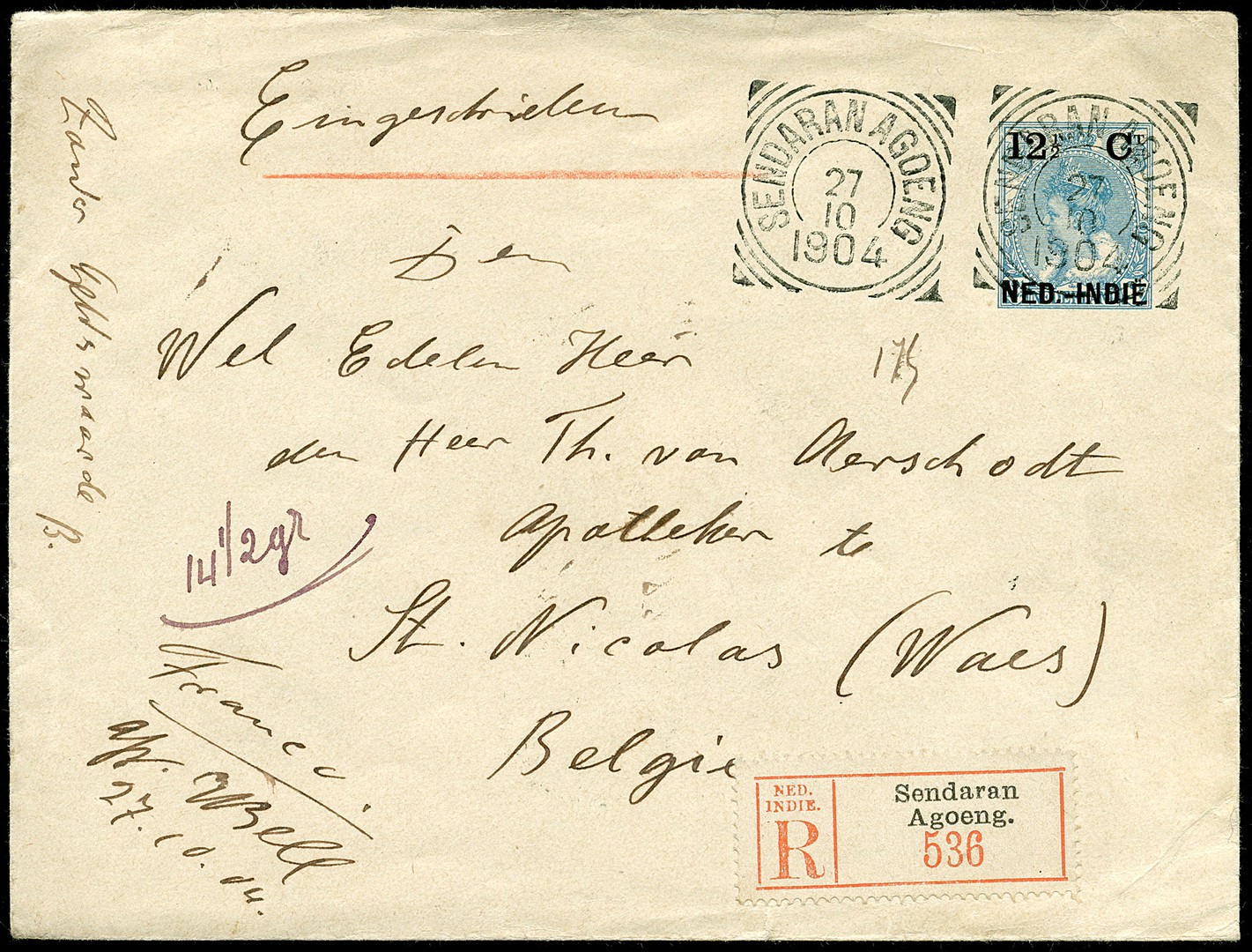 SENDARAN AGOENG op env. G19 met op az. bijgefr. met 2x 2½c (1 ex. verwijderd) aangetekend van 27-10-1904 over Padang 4-11 naar een apotheker te St. Nicolas (B) 5-12. Tevens luxe afst. op dubbele bk. G13 (met geschreven tekst) en bk. G16, beide uit 1904 en naar familie in Duitsland