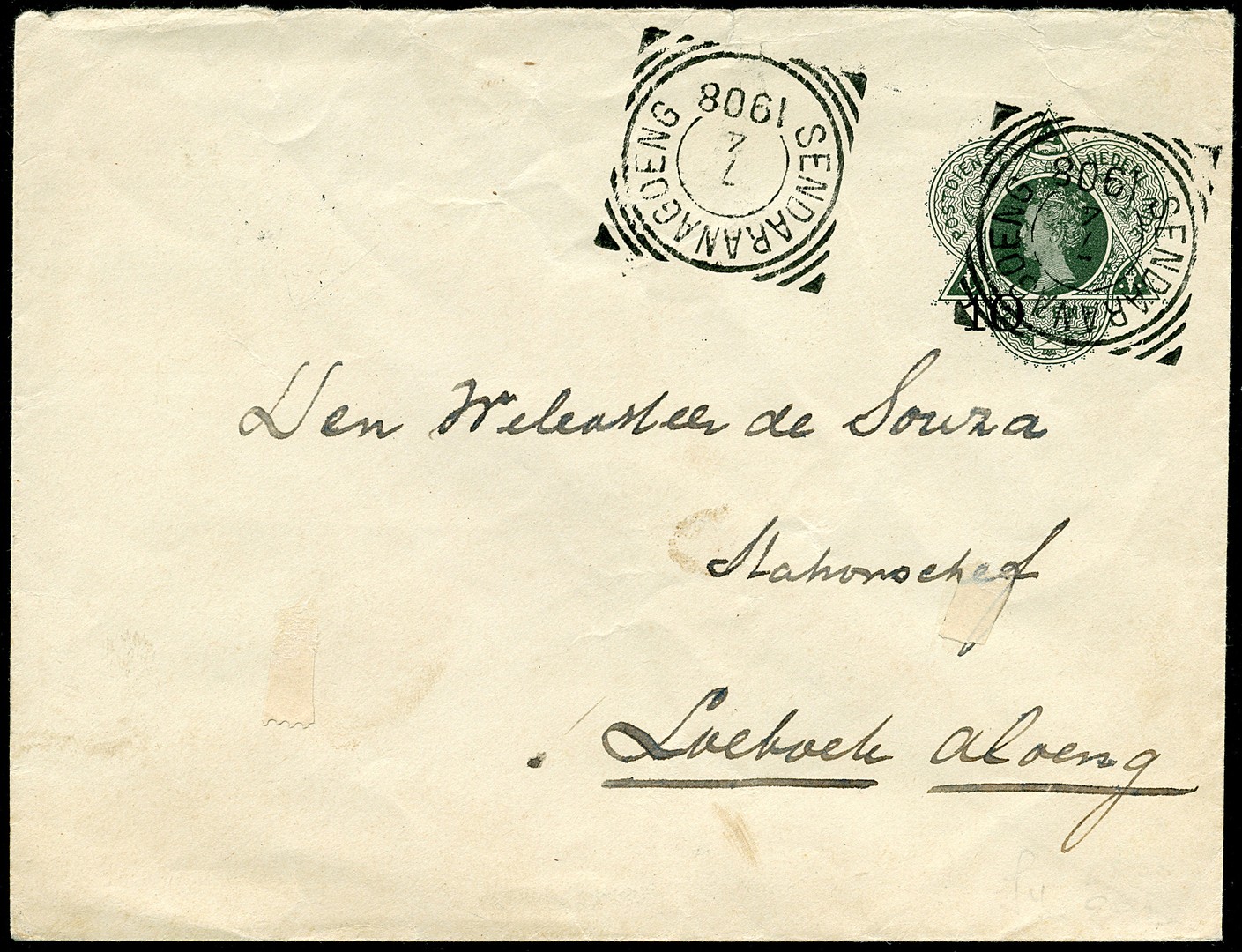 SENDARANAGOENG op env. G25 (klep ontbreekt) van 7-4-1908 over Padang 12-4 naar de stationschef van Loeboekaloeng. Twee kopstaande, maar wel prachtafdrukken van dit tweede type vierkantstempel van dit kantoor. Op losse zegel schaars, op poststuk zeer zeldzaam!