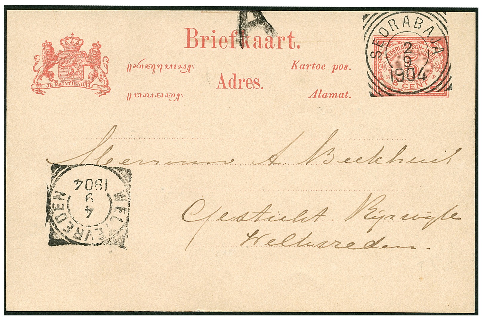 SEORABAJA op bk. G14 van 2-9-1904 naar een gesticht te Weltevreden 4-9. Superbe afst. van deze stempelfout (SvL 225)