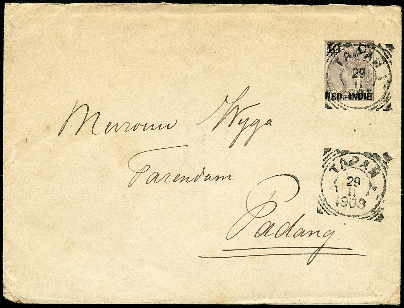 TAPAN op iets smoezelige env. G18 van 29-11-1903 naar Padang 4-12. Mooie afdrukken van dit veldpostkantoor (tot 15-12-1903, SvL 150)