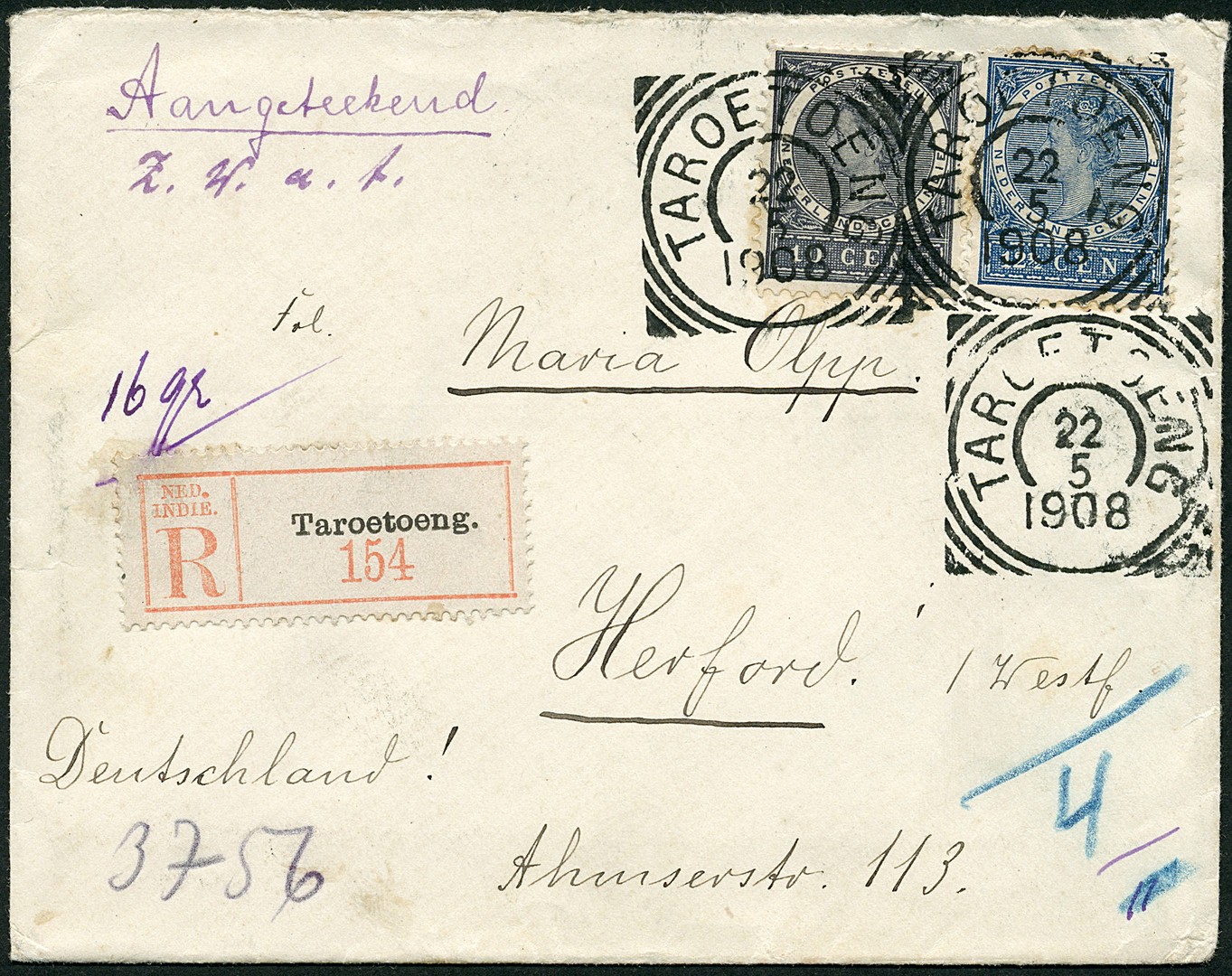 TAROETOENG op env. van 16 gram gefr. met 10c en 12½c Veth aangetekend op 22-5-1908 over Padang 26-5 naar Herford (D) 22-6