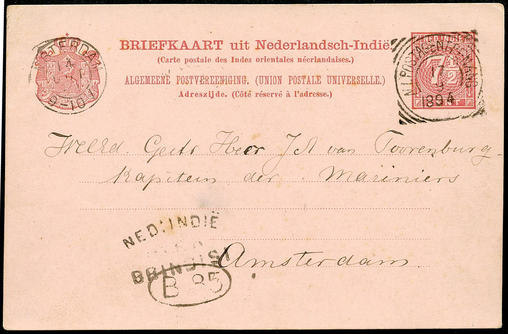 N.I.POSTAGENT PENANG op bk. G12 geschreven te Olehleh 13-9-1894 maar pas afgest. op het postagentschap op 17-9 en over Brindisi naar Amsterdam 14-10. Mooie afst. (SvL 100)