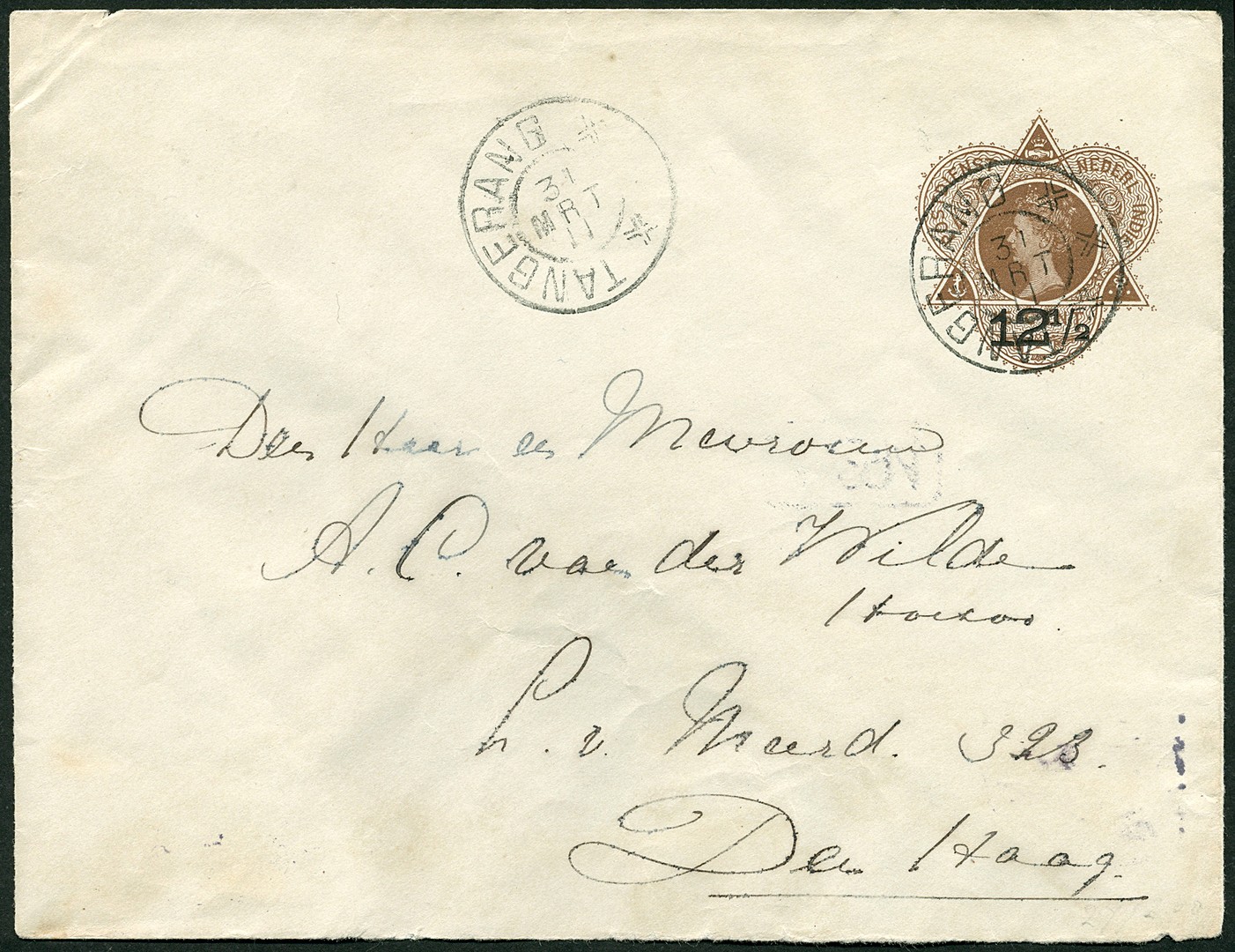 Env. G29 (klep ontbreekt) van Tangerang 31-3-1911 naar ´sGravenhage 1-5. Twee mooie afdrukken van het vooral op poststuk zeldzame grootrondstempel (SvL R)