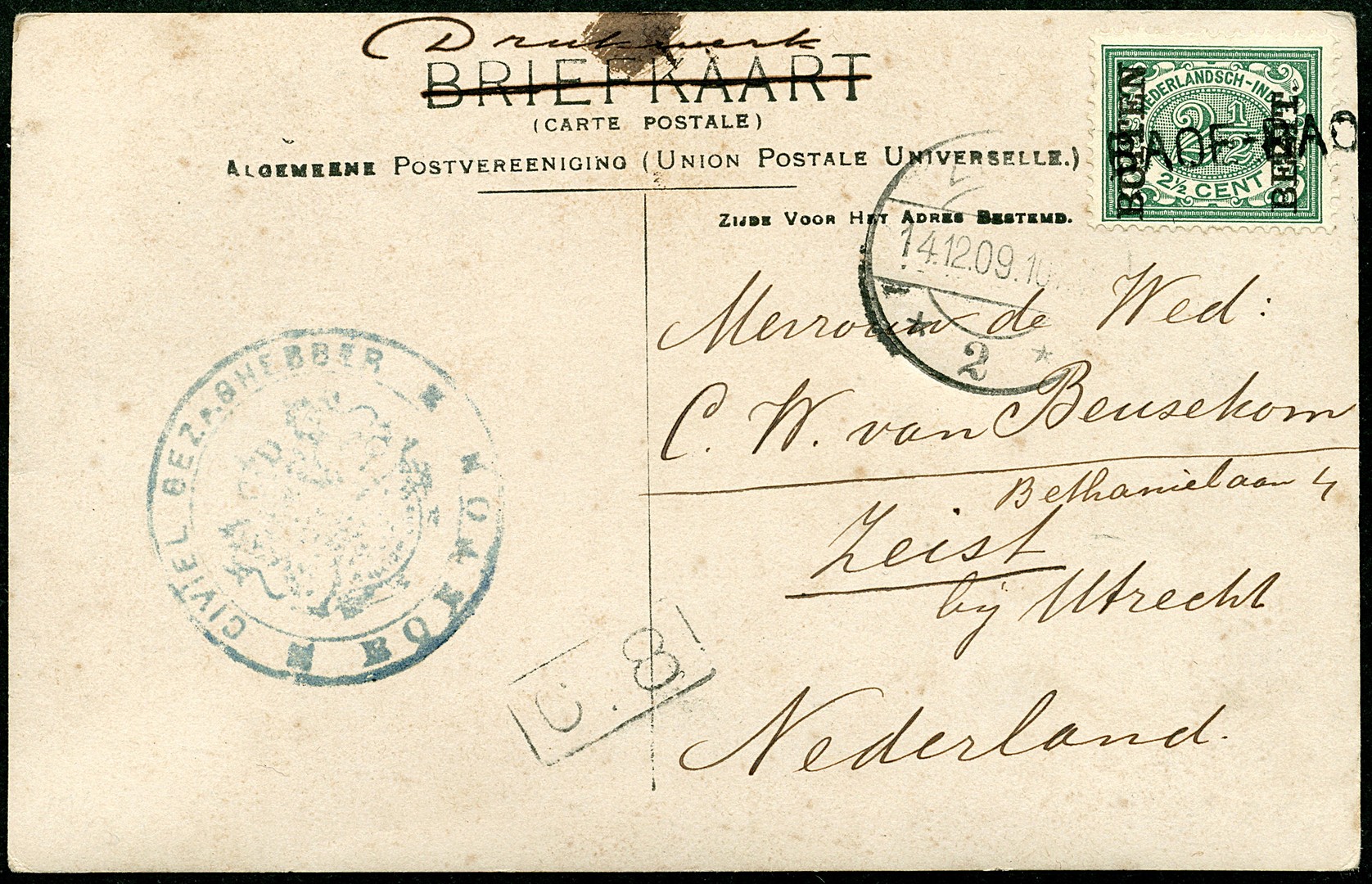 Fotoprentbk. (gezin met djongos, afzender?) gefr. met 2½c BB van BAOE-BAOE naar Zeist 14-12-1909 met links afz.-stempel Civiel Gezaghebber Boeton (L, SvL 125)