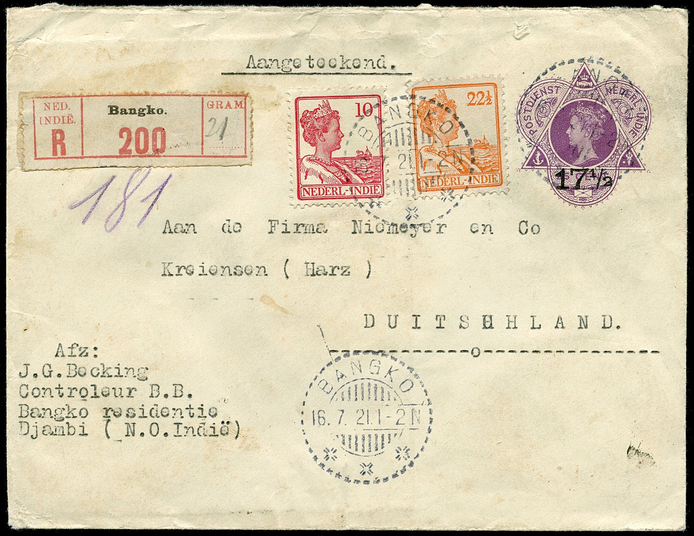 Env. G31 bijgefr. met 10c en 22½c van Bangko 16-7-1921 aangetekend over Singapore 1-8 naar Kreiensen (D) 9-9. Schaars, zeker als R-brief (SvL 175)