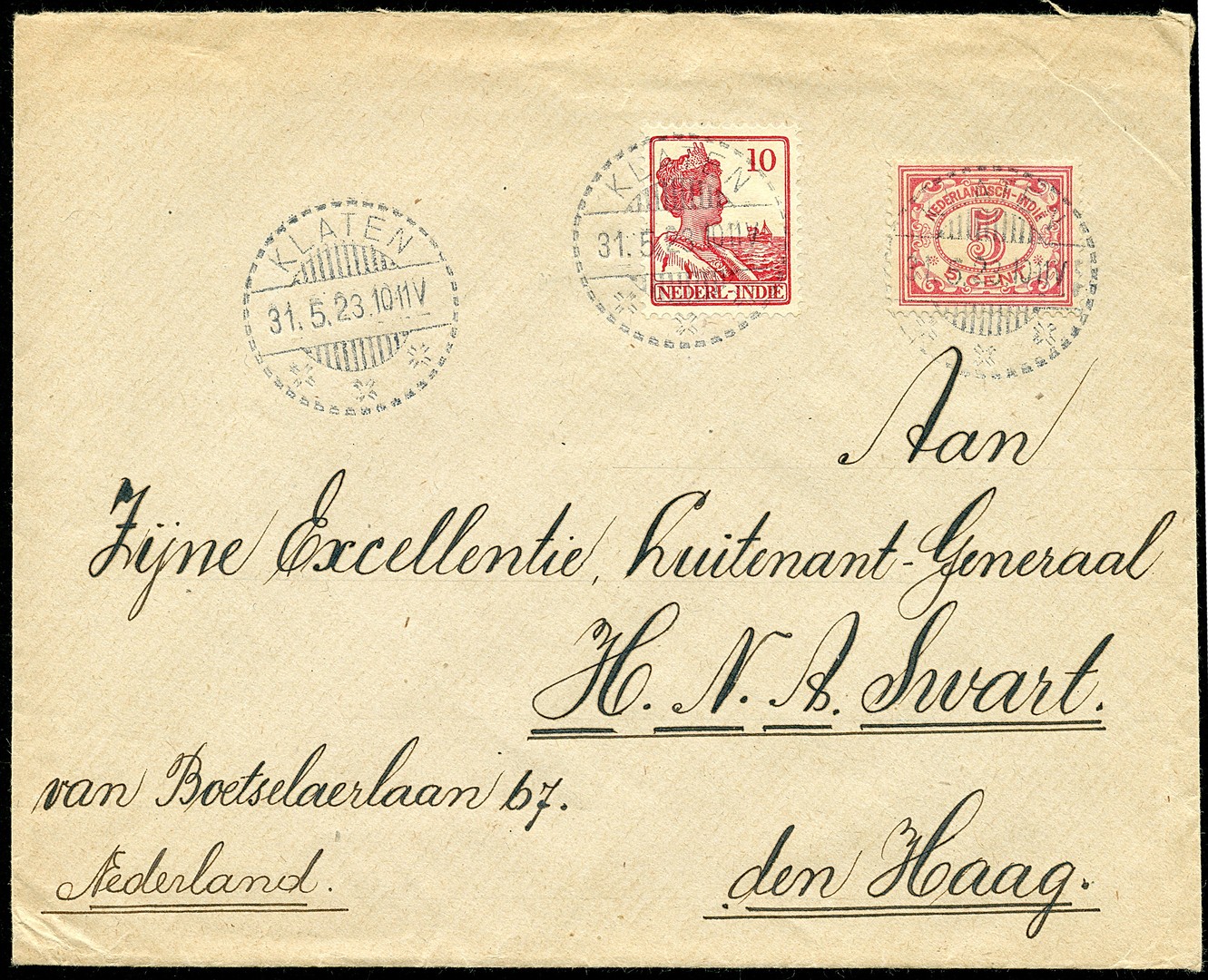Env. gefr. met 5c en 15c van Klaten 31-5-1923 naar een generaal in Den Haag