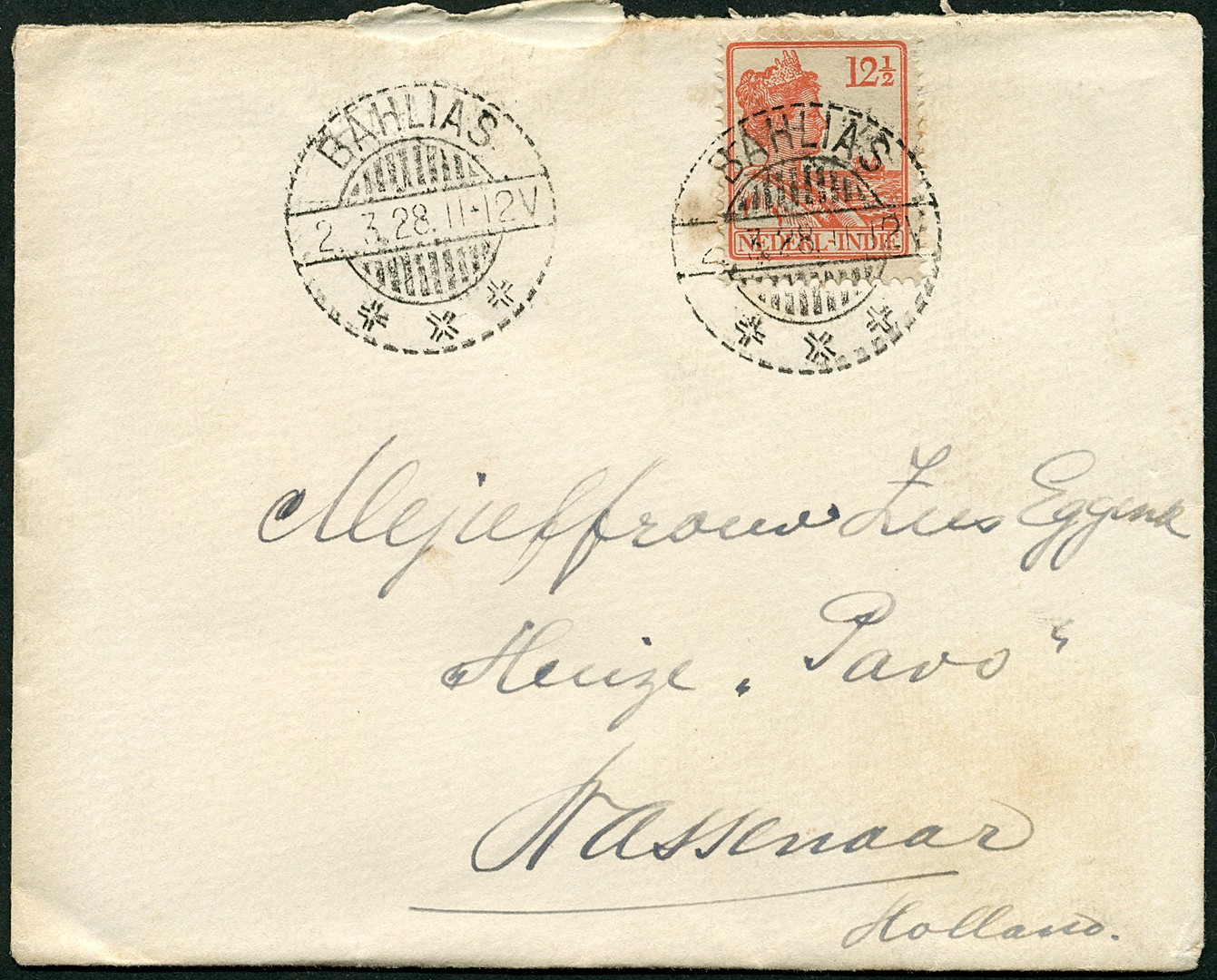 Vier verschillende typen langebalkstempels van Bahlias 1927-28 op vier env. en dat voor een kantoor dat maar 12 jaar geopend was