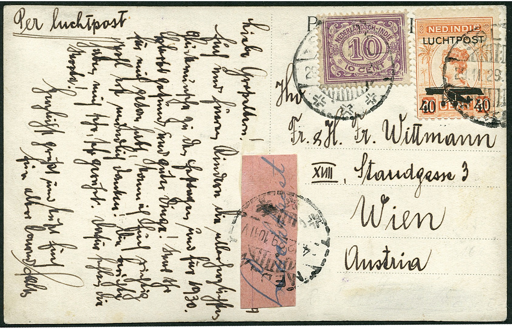 Roze noodstrookje waarop geschreven ´Luchtpost´ op prentbk. gefr. met 10c en 40c van Solo 29-11-1929 via Medan 4-12, waar mogelijk dat noodstrookje is opgeplakt, naar Wenen. Door ons nog niet eerder gezien