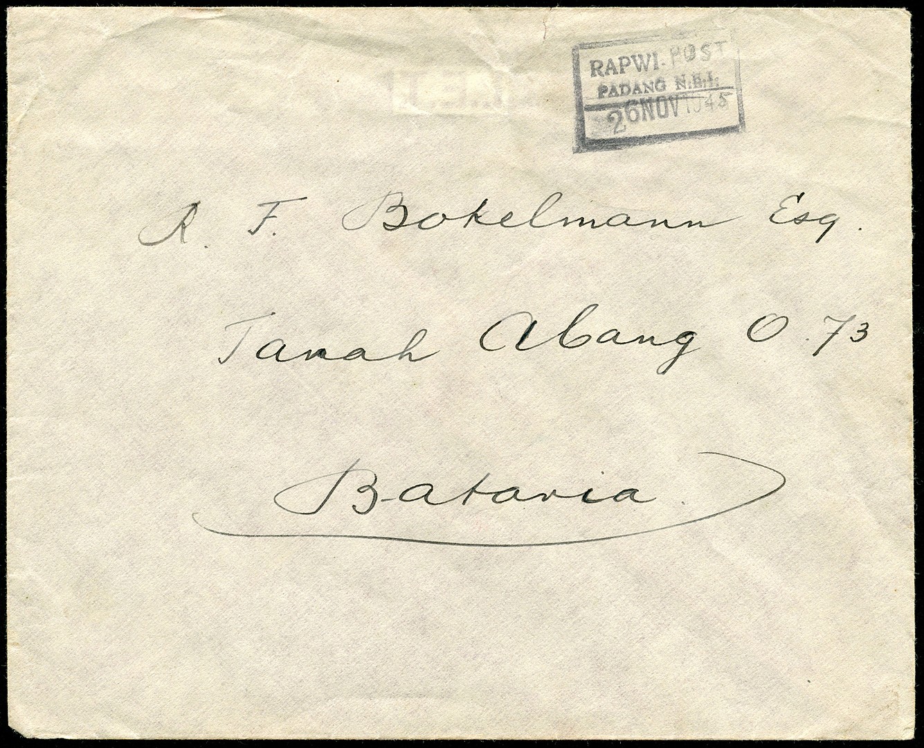 RAPWI. Rechthoekig stempel van Padang in zwart op envelop van 26-11-1945 en in blauw op air letter van 26-1-1946