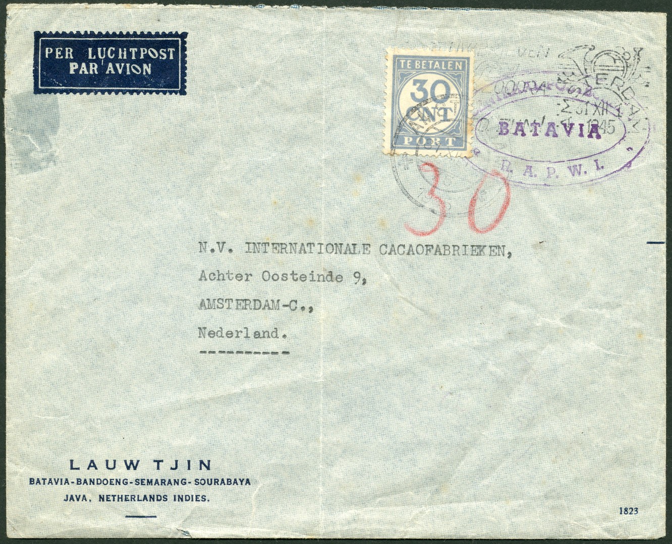 AMACAB/RAPWI. Drie poststukken afgest. Amacab-postkantoor te Batavia-Centrum (Bu. blz. 353 nr. 3a) w.o. aangetekend, alsmede drie op het Rapwi-postkantoor w.o. ovaalstempel uit 1945