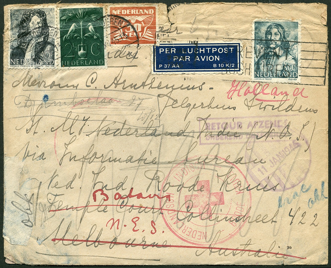 Rode Kruis. Vijf poststukken m.b.t. RK 1945-48 w.o. zwerfbrief (heeft fysiek geleden), alsmede postblad met stempel t.b.v. RK 1873-1945