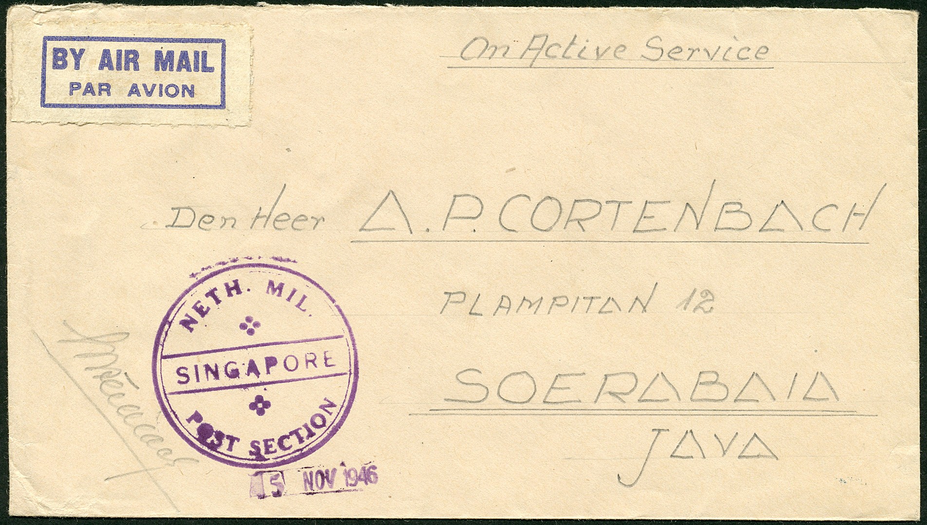 Env. van sgt. bij Neth. War Crimes Liaison Section, met superbe afst. ´Neth. Mil./Post Section/Singapore´ op 5-11-1946 per luchtpost naar Soerabaja 9-11