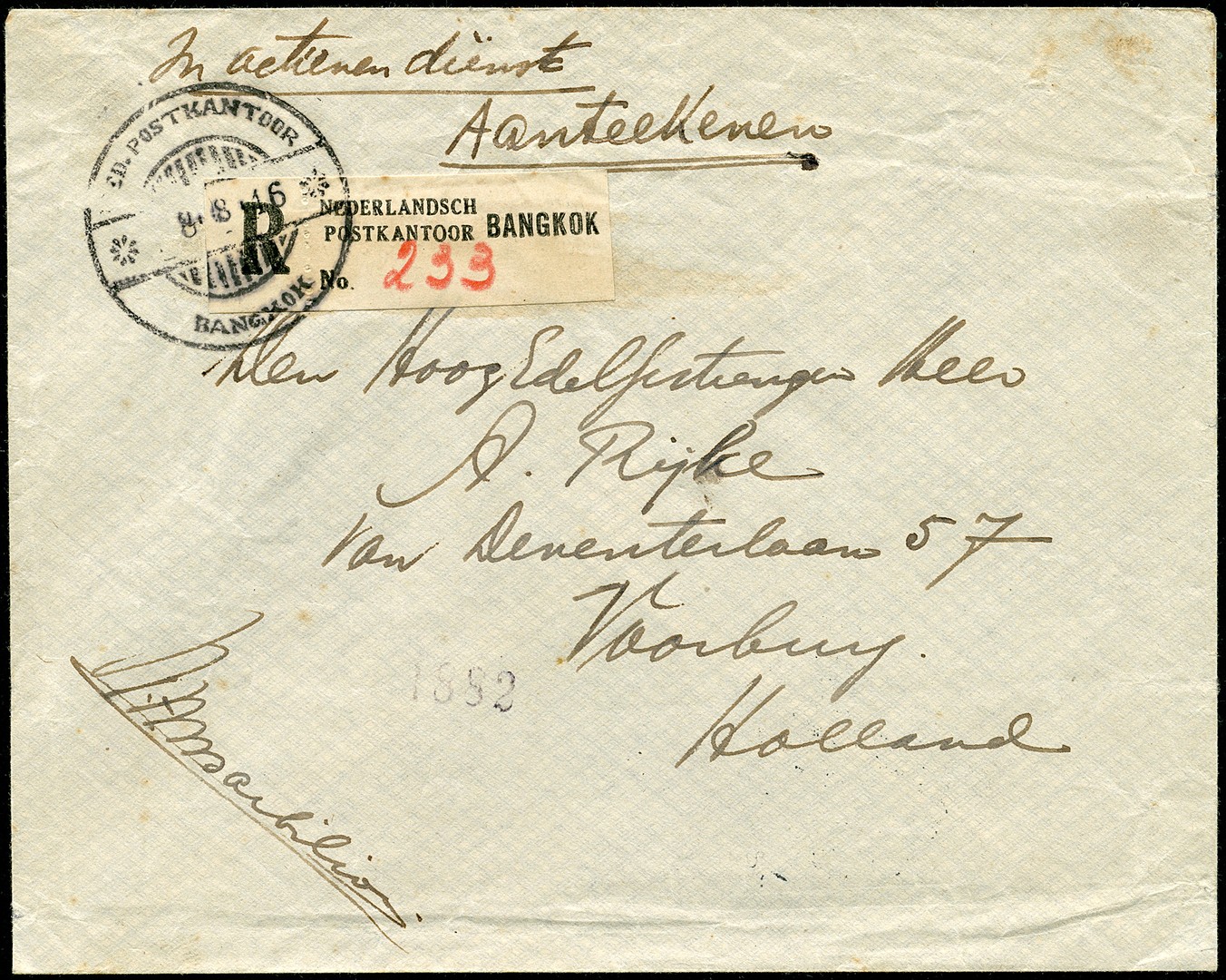 Env. met als afz. soldaat in actieve dienst, p/a het Trocadero Hotel in Bangkok, aangetekend verz. van het NEDERLANDSCH POSTKANTOOR BANGKOK 8-8-1946 per luchtpost naar Voorburg 13-8. Uitermate zeldzaam poststuk en ons geen tweede bekend met een R-strookje. Tentoonstellingsstuk! Ex Hiegentlich