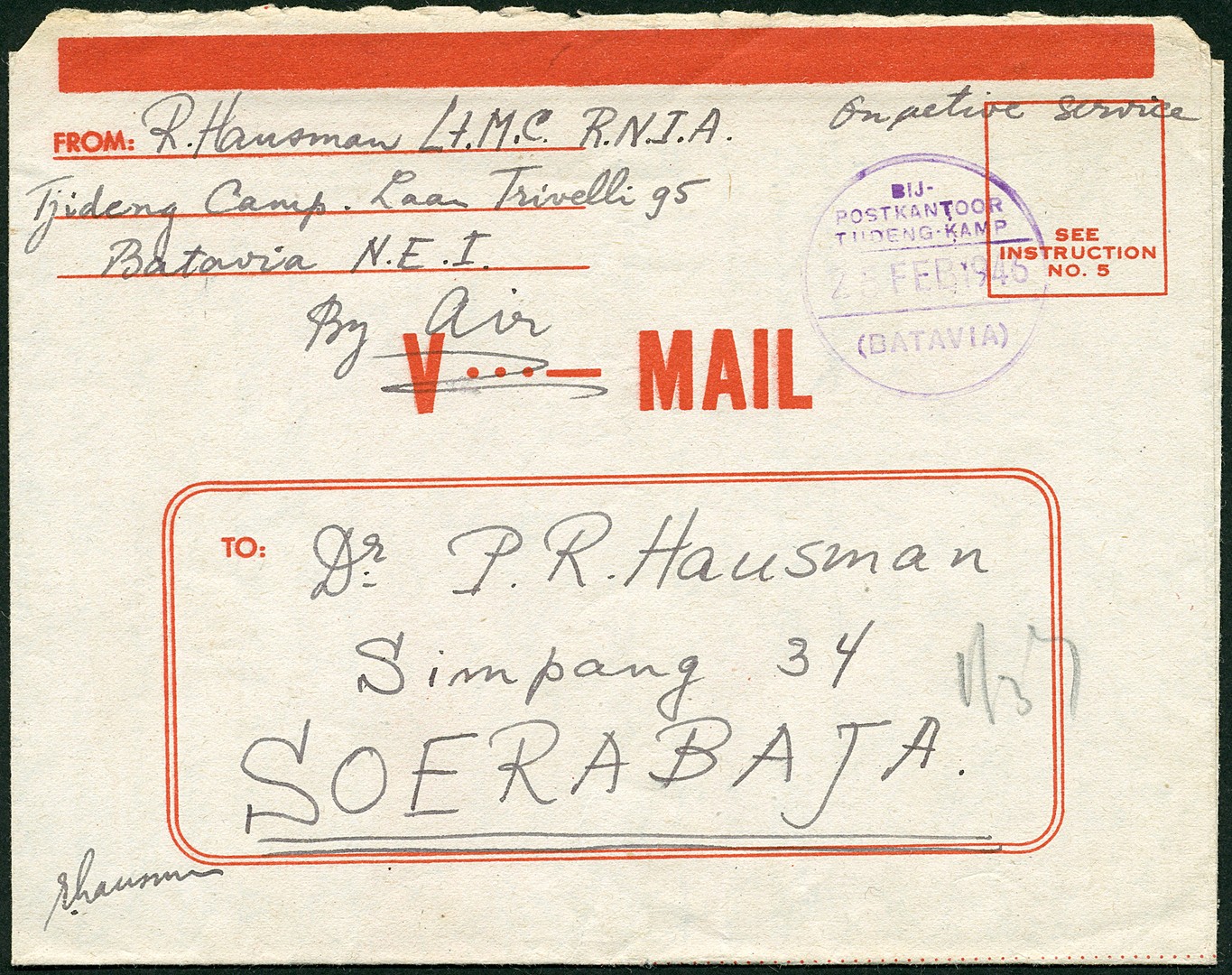 V-MAIL postblad vanuit het Tjideng-kamp te Batavia 25-2-1946 per luchtpost naar vader te Soerabaja 1-3. Schaars poststuk
