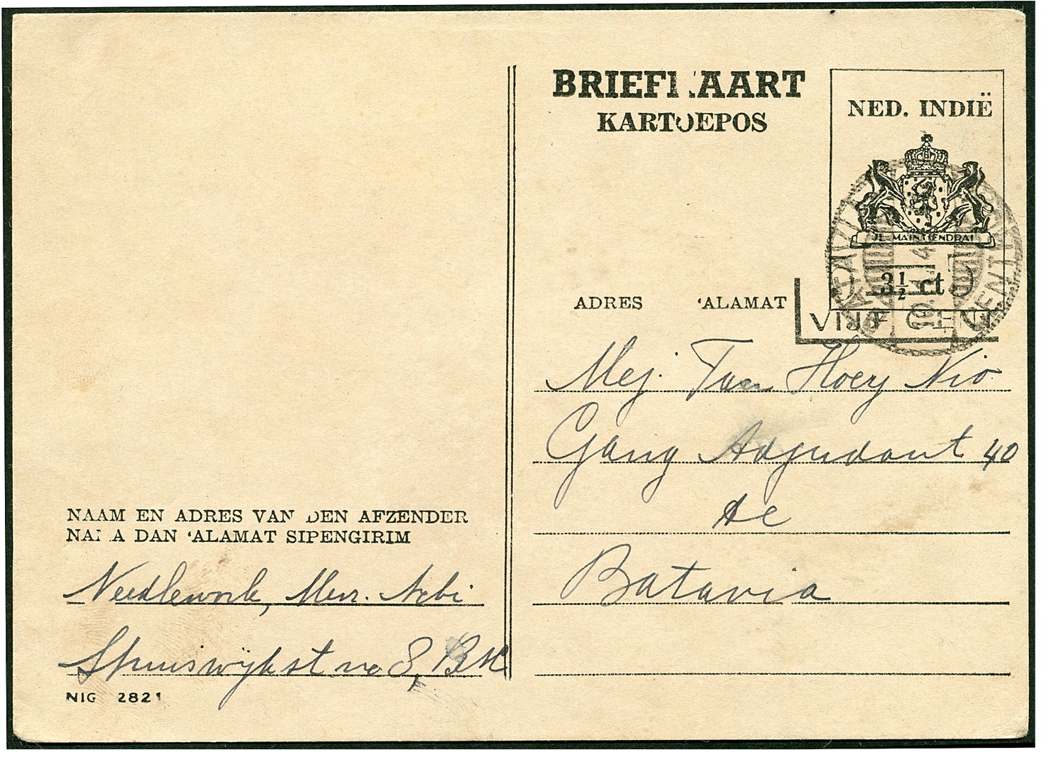 Bk. G76b met (a.g.v. slechte druk) variëteit ´Twee in plaats van drie opdrukstrepen´ verz. te Batavia-/Centrum 10-1-1948. Ter vergelijking normaal ex. bijgevoegd