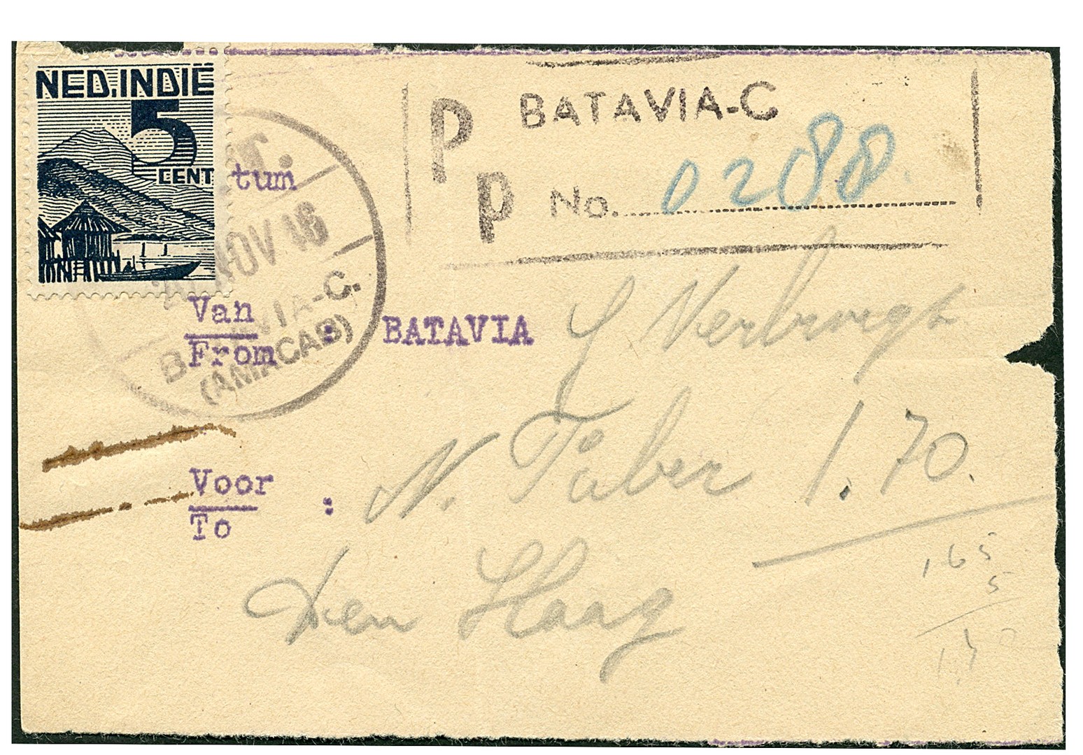 Drie verschillende typen ontvangbewijzen voor een verzonden postpakket Model Pp4, van het Amacab-kantoor te Batavia-C (aangetekend op 20-11-1946) waarop 5c nr. 320, gefr. met 5c nr. 307 afgest. Soerabaja-/Pakketpost 11-3-1947, alsmede gefr. met 2x 5c karbouw uit Ampenan 11-11-1947 (nieuw tarief)