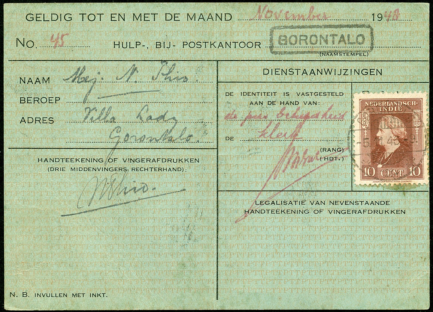 Controlekaart (zonder drukmerk) waarop 10c ABC afgest. Gorontalo 5-11-1946